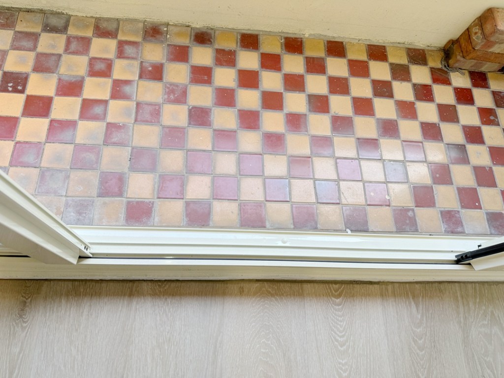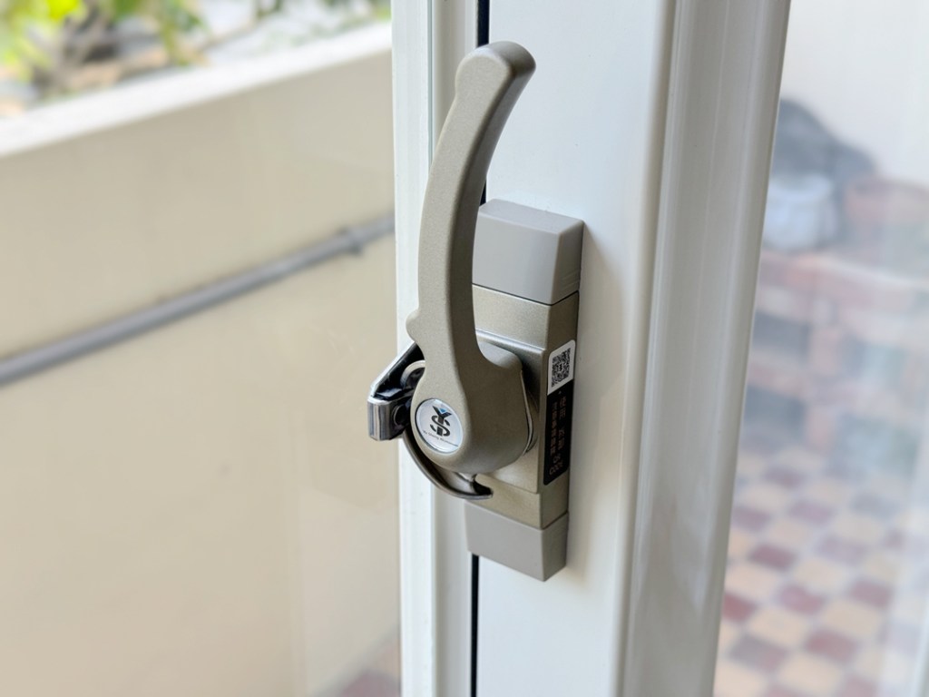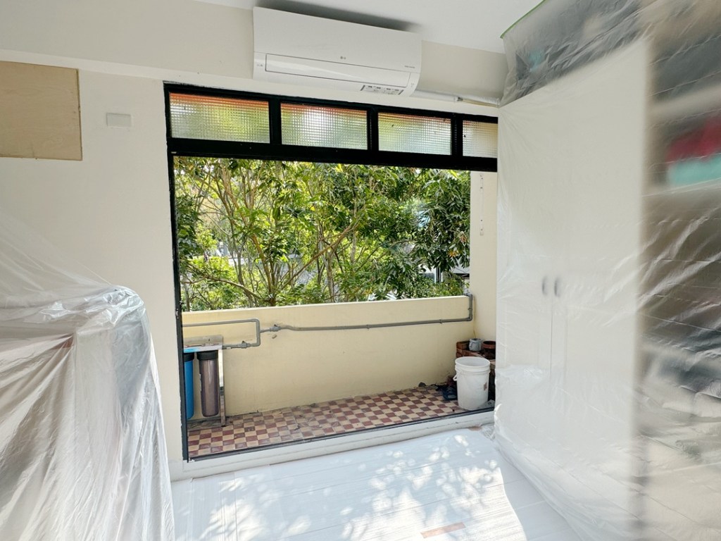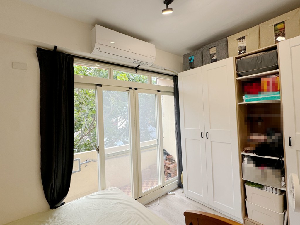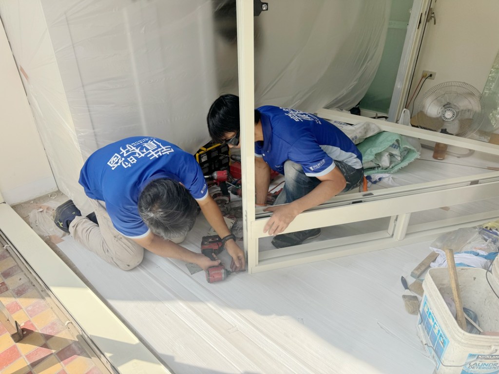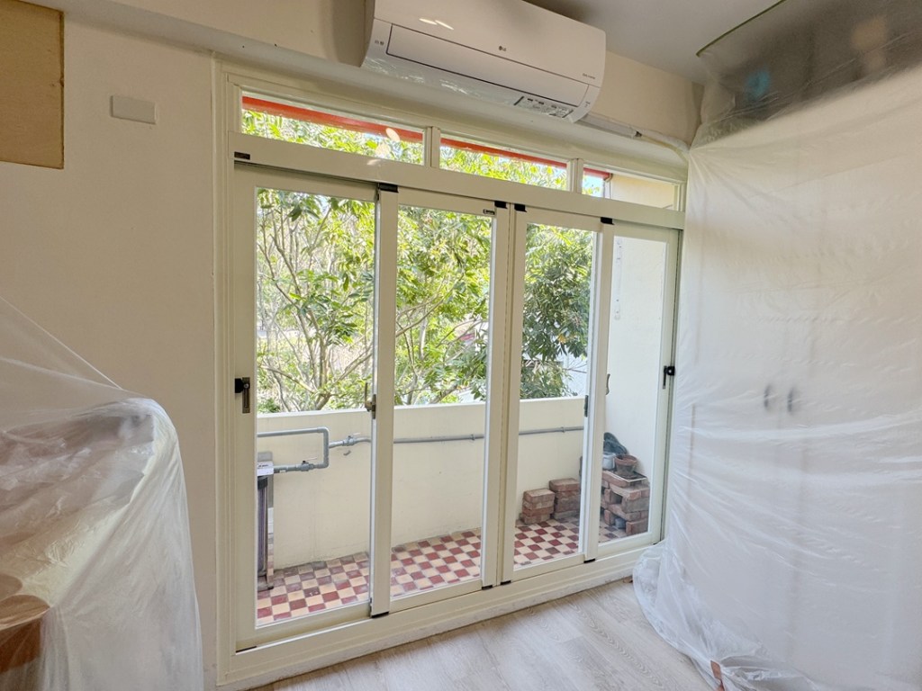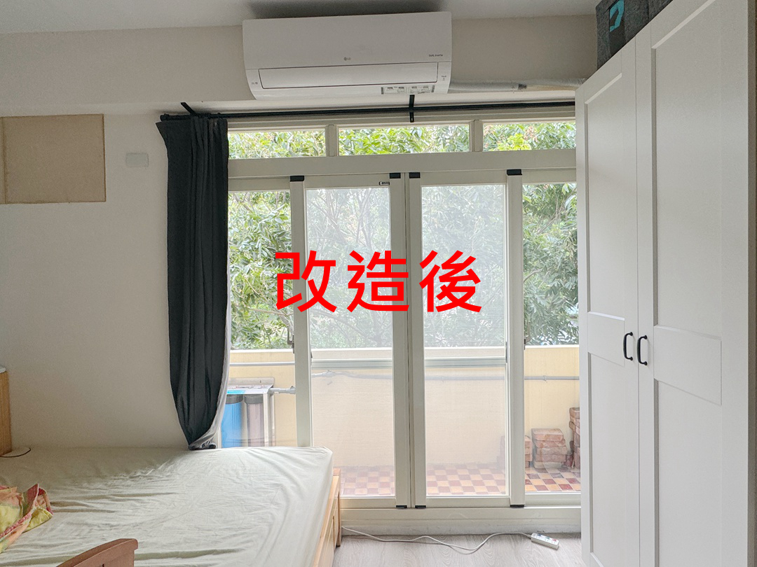 業主家主臥室落地窗老舊會漏風,選擇乾式施工的包框方式,安裝氣密落地窗加強隔音。