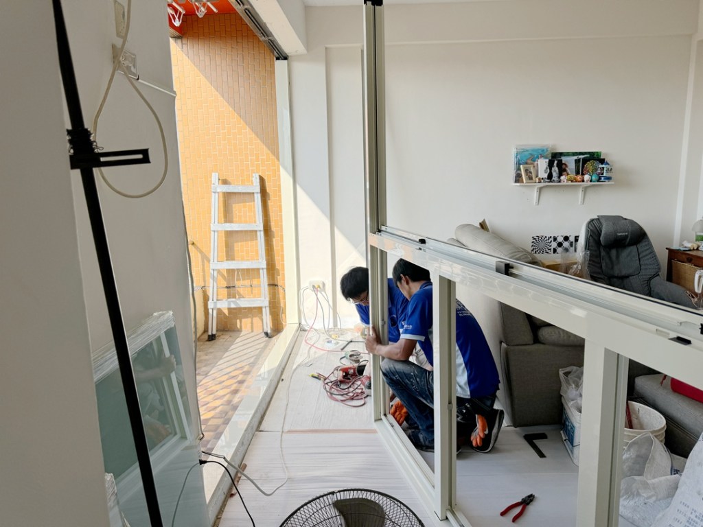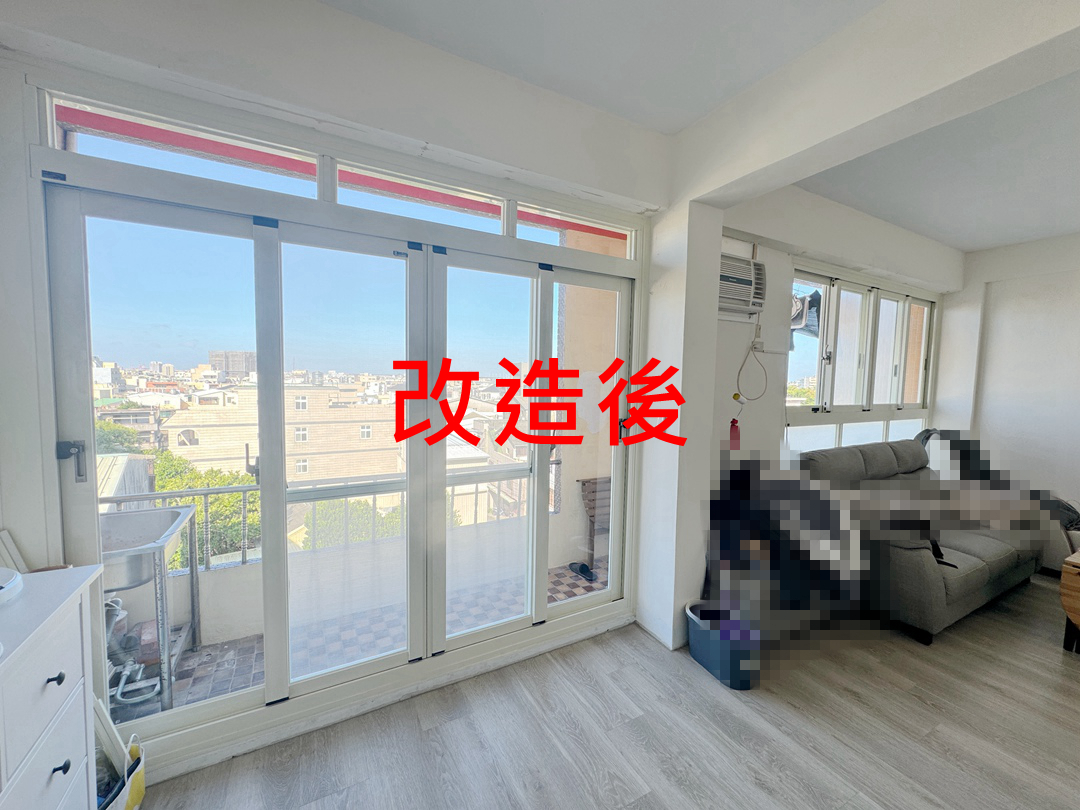 台中清水童先生住家門窗想重新整理,客廳大空間坐擁二個大落地窗。因家庭成員增加,業主設計空間重新規劃,舊型落地窗改為下固定窗搭配四拉氣密窗,另一座改為四拉氣密落地窗,方便進出陽台。此次乾式施工的包框方式,捨棄線條感強烈的深色鋁框,這次選擇乳白色框搭配透明玻璃,讓室內感覺更加明亮寬敞。透明玻璃讓自然光撒落,享受舒服清新居家氣息。