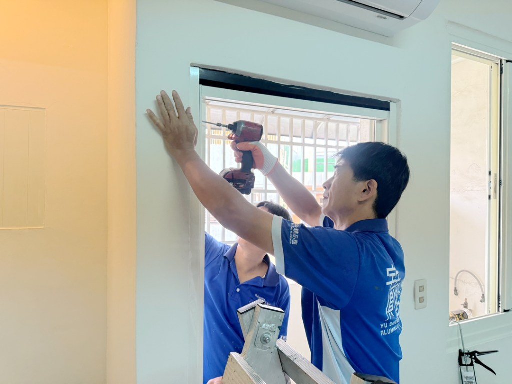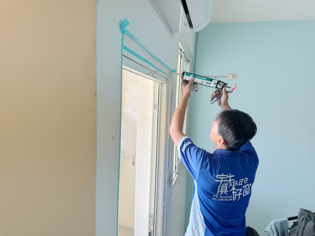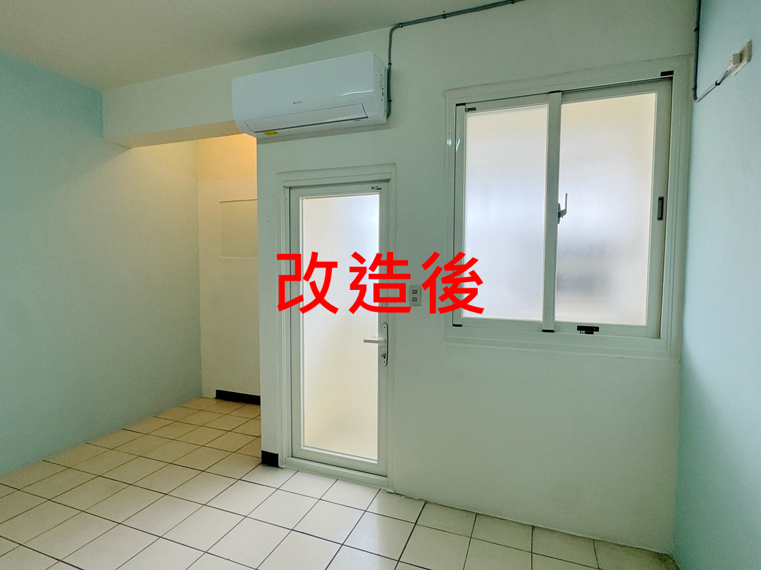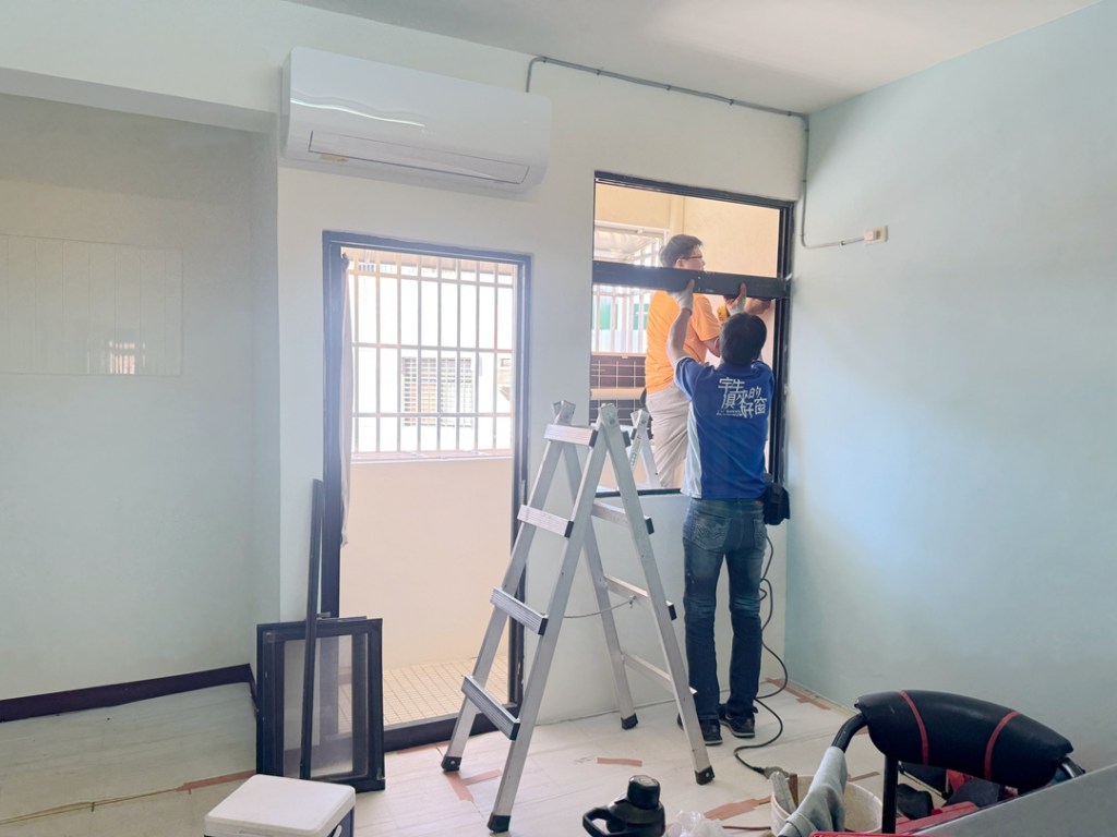 業主房間原為舊式鋁門和鋁窗,整修房間更換密合度更好的氣密門窗。建議採用氣密窗搭配加壓氣密門。此次以包框方式的乾式施工,玻璃則選用噴砂玻璃,保有隱私。施工一天完成,不需泥作。