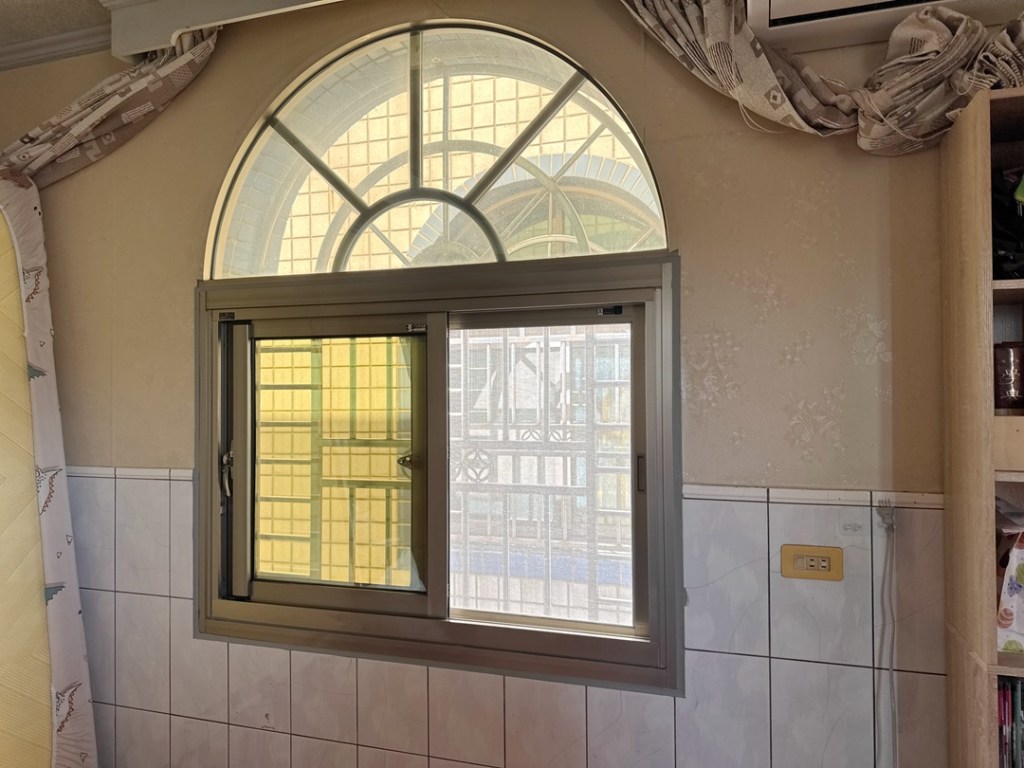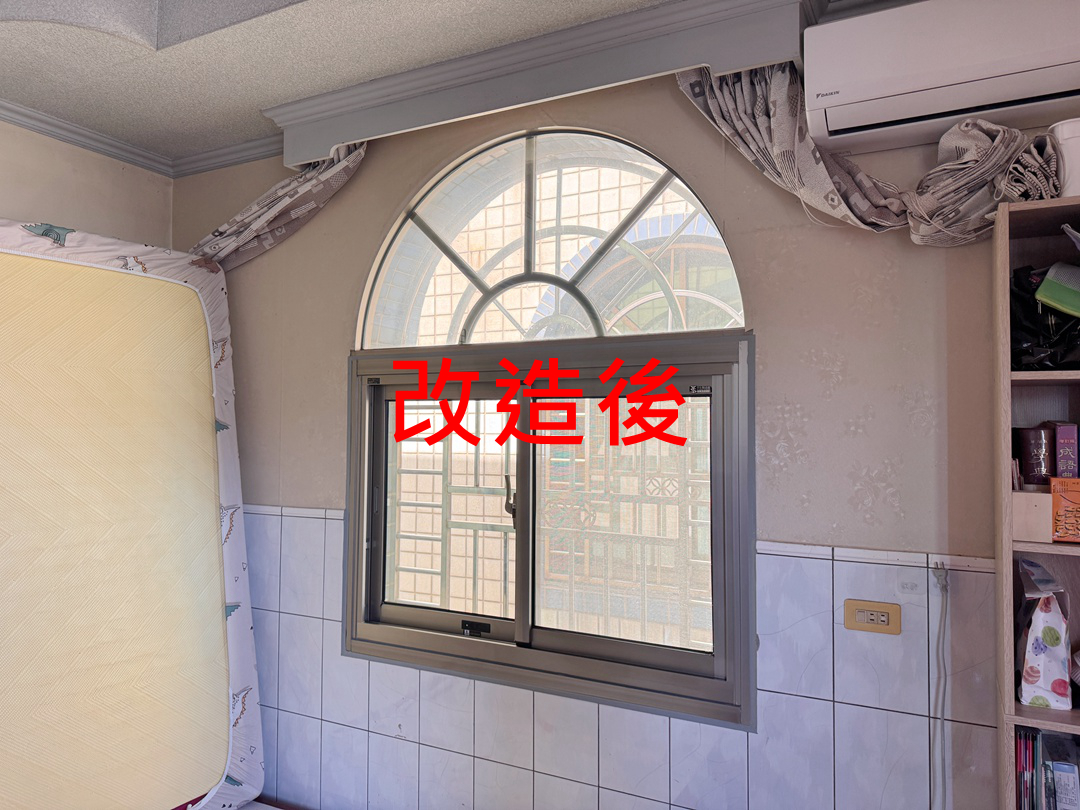 舊式圓拱鋁窗的改裝不易,建議原本上方固定的窗戶保持不變,僅將下方的鋁窗更換為高效能氣密窗,即可達到更好的抗風、氣密效果。