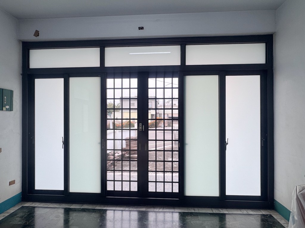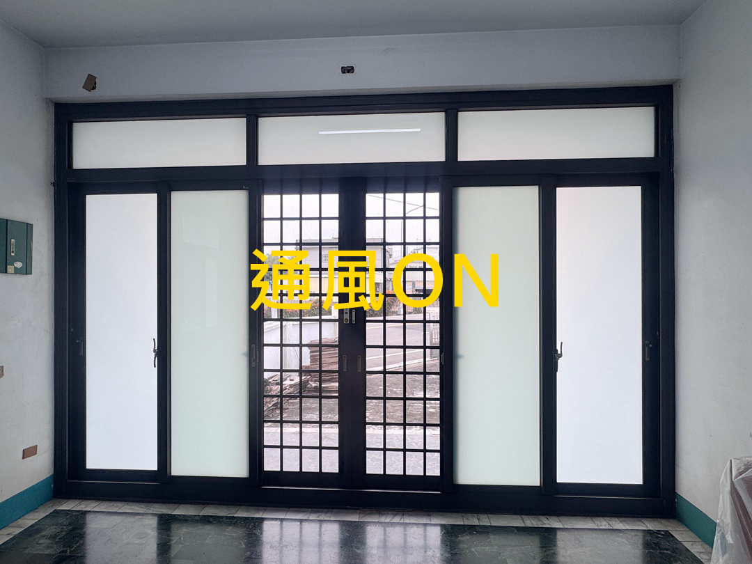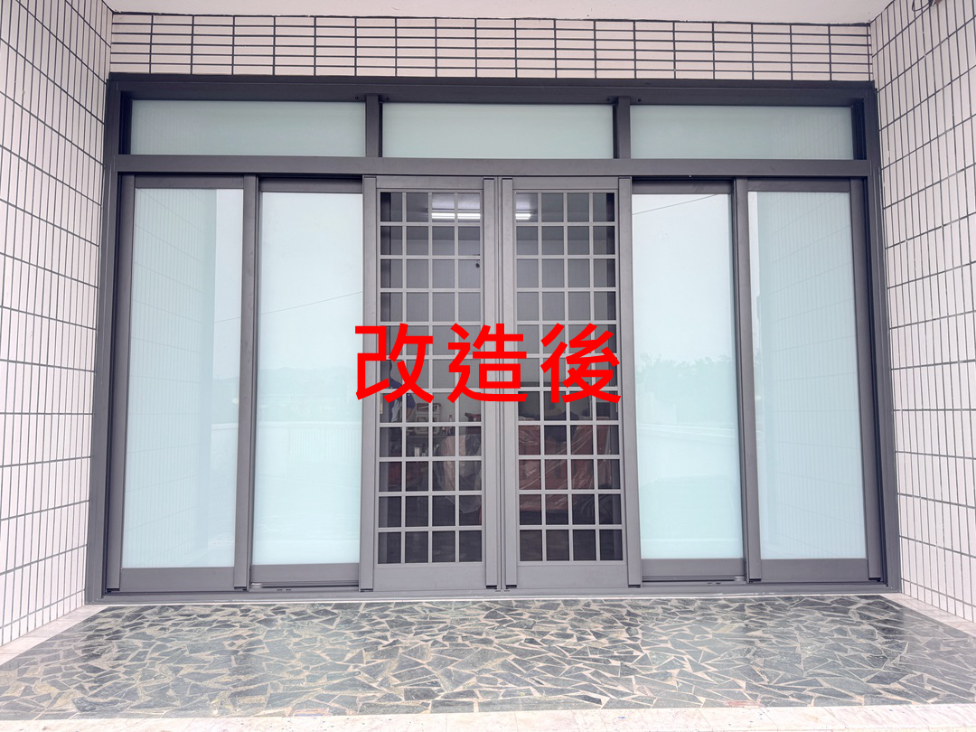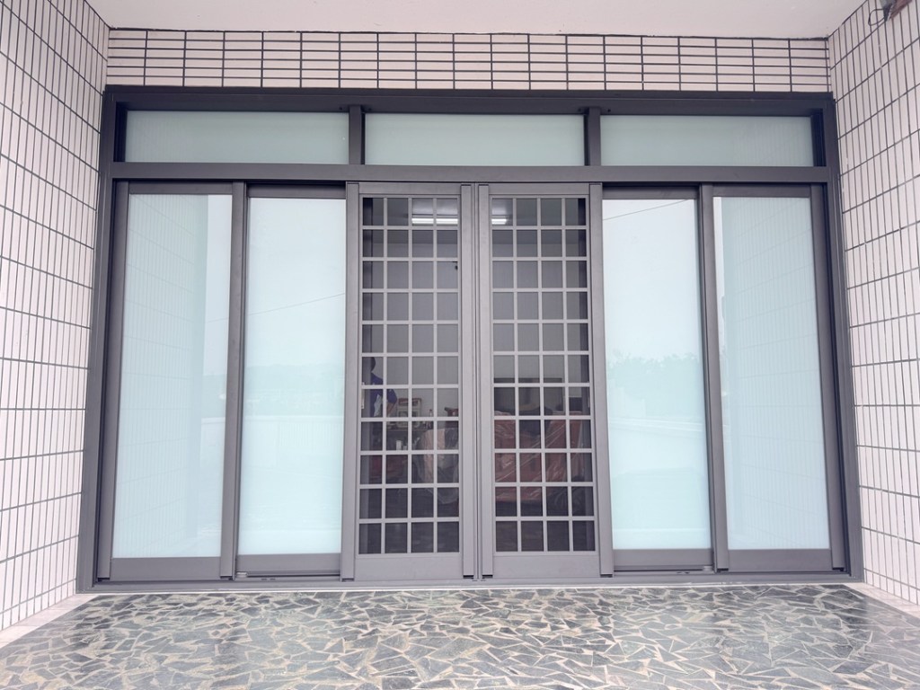 紗門部分提供兩種選擇:經典款與鋁格款(可依需求選擇格子大小)。本案中,業主選用鋁格款紗門,窗框顏色為鐵灰砂色,搭配白膜膠合玻璃,兼顧採光與隱私性,整體外觀質感佳且功能性強。