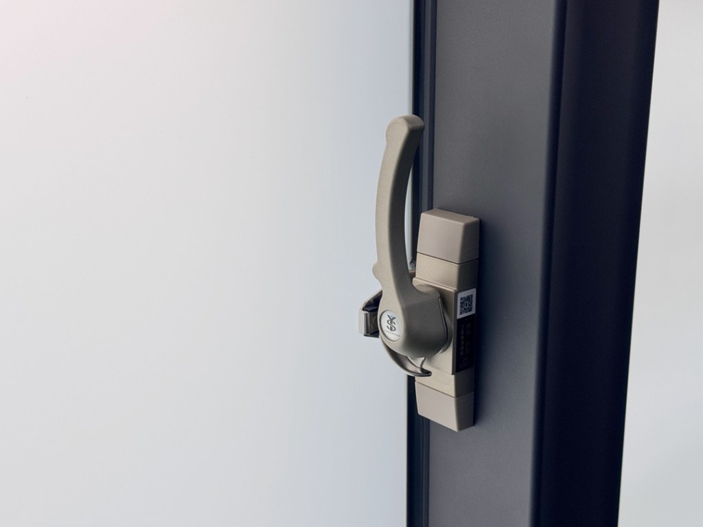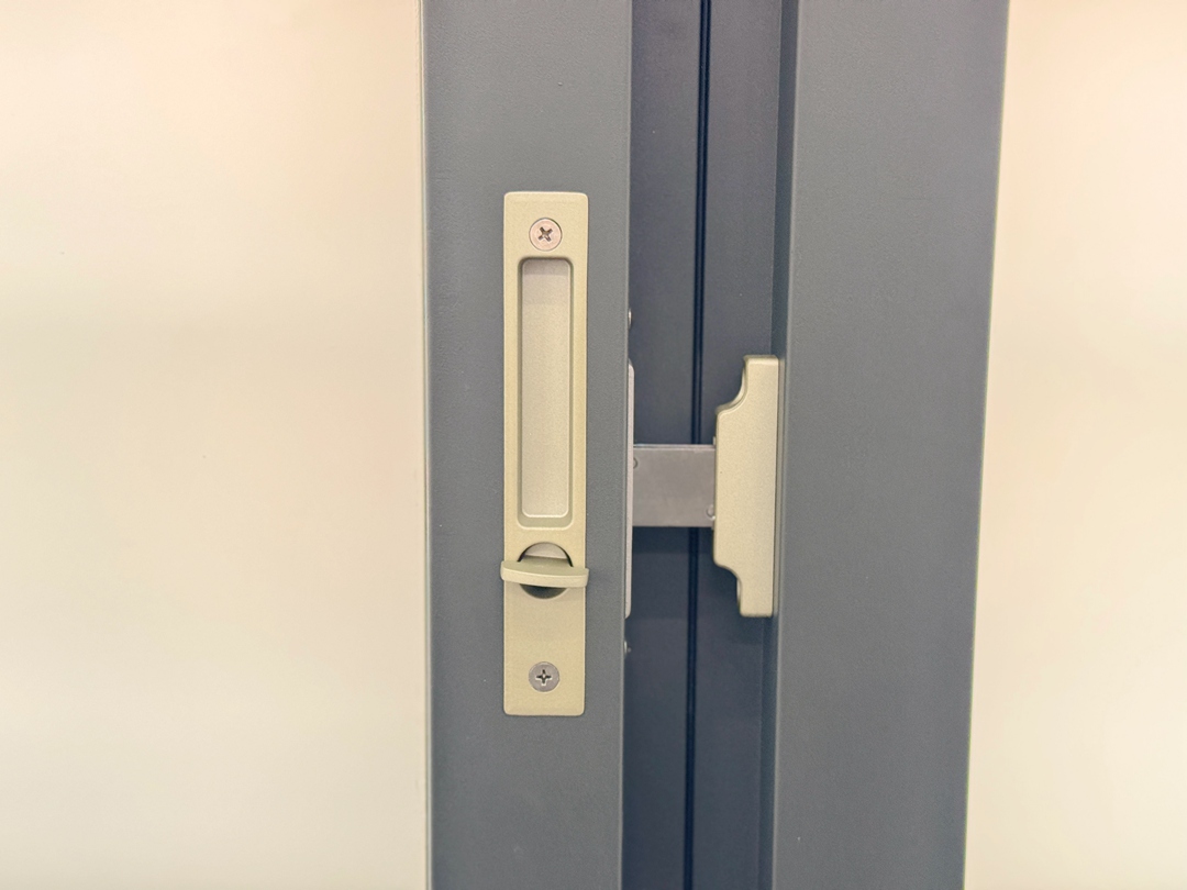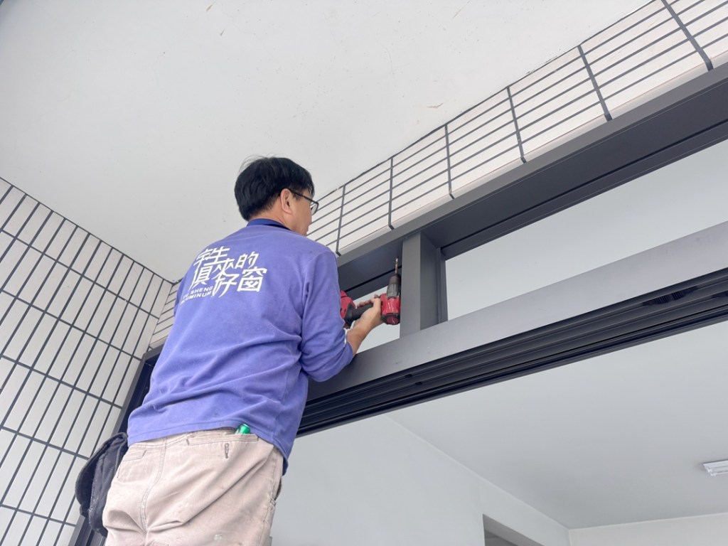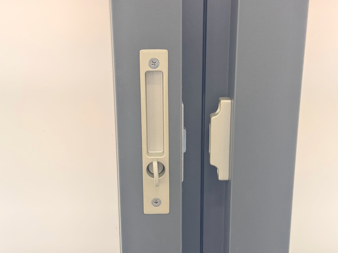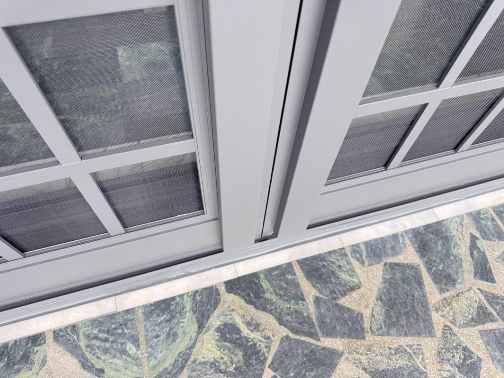 紗門部分提供兩種選擇:經典款與鋁格款(可依需求選擇格子大小)。本案中,業主選用鋁格款紗門,窗框顏色為鐵灰砂色,搭配白膜膠合玻璃,兼顧採光與隱私性,整體外觀質感佳且功能性強。
