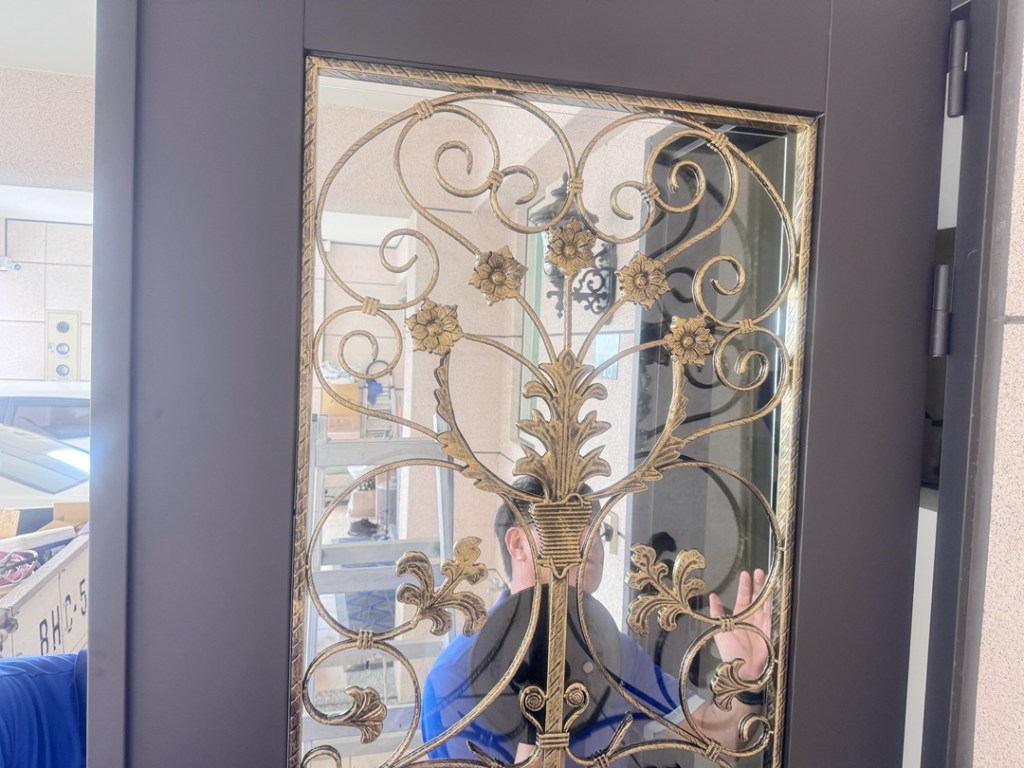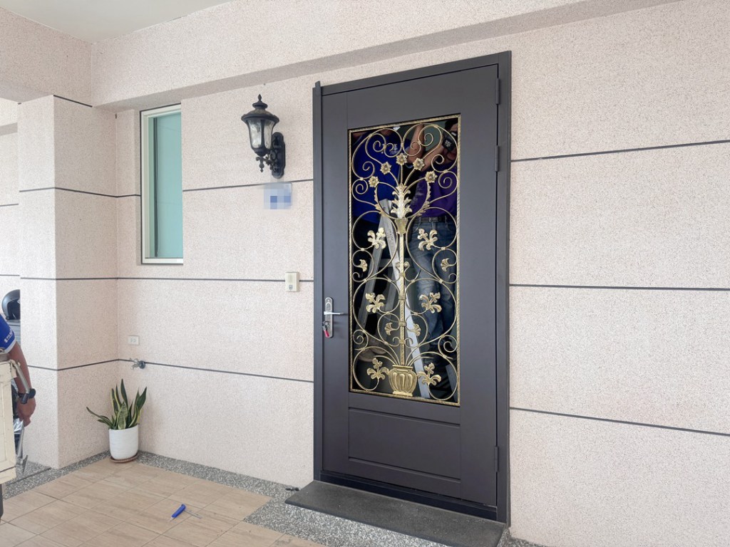解決方案:經現場評估,原門框為雙玄關門框,僅需加裝門片即可。業主選擇鐵灰砂色的鍛造門花門並加選自動關門的門弓器,當天完工。