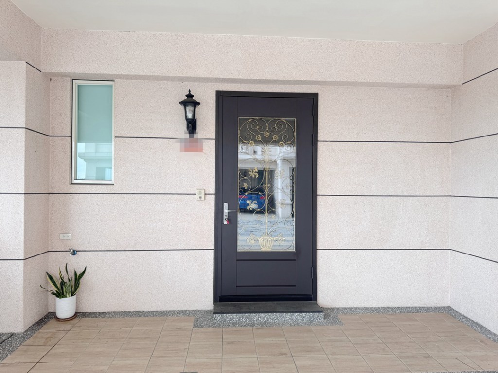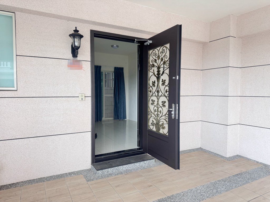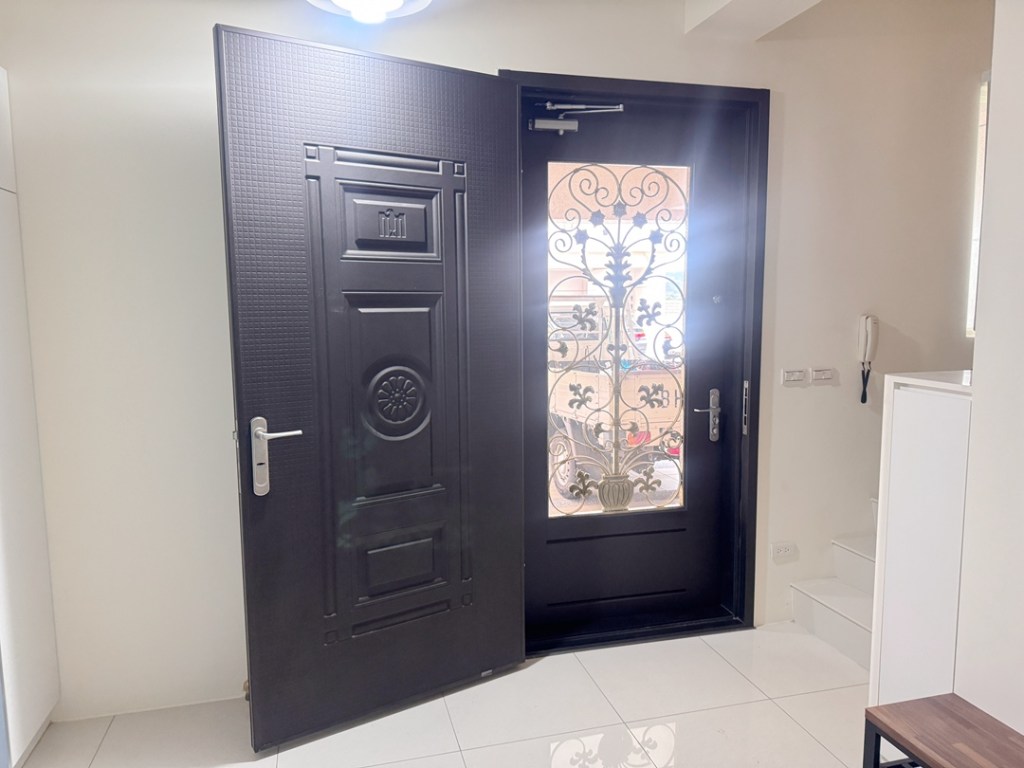 業主選擇鍛造花玄關門,搭配透明玻璃,保留自然光。大門加裝門弓器,可自動關門,安全防蚊。