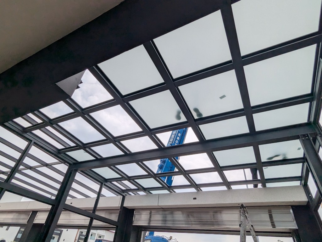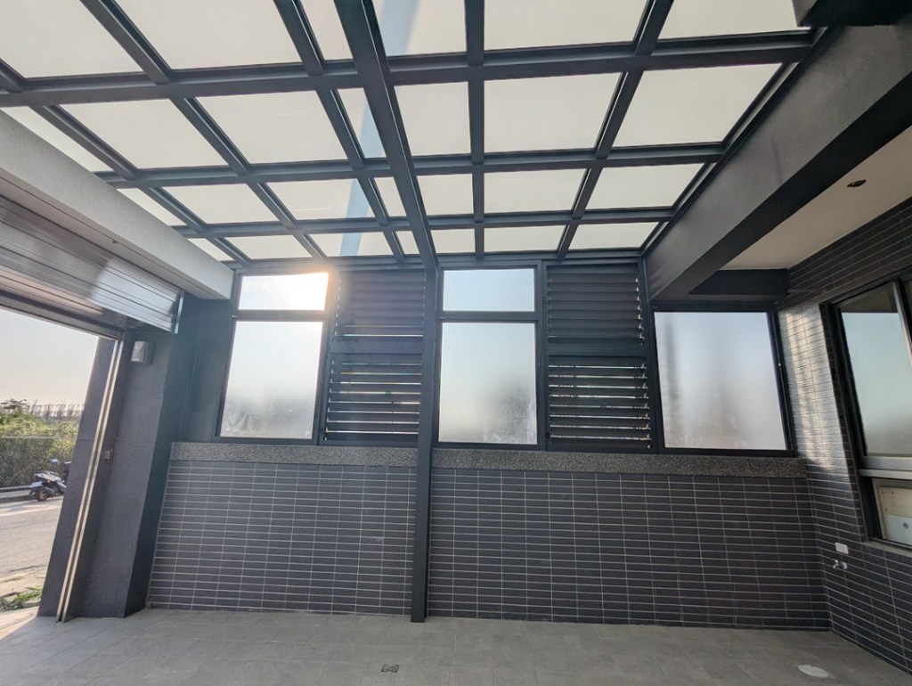 採光罩結構採用鋁合金骨架搭配膠合安全玻璃,相較於傳統PC板材質,不僅更耐候耐用,亦具備更高的安全性與穩定性。玻璃上層設計提供絕佳自然採光,讓整體空間明亮通透,營造舒適室內氛圍。