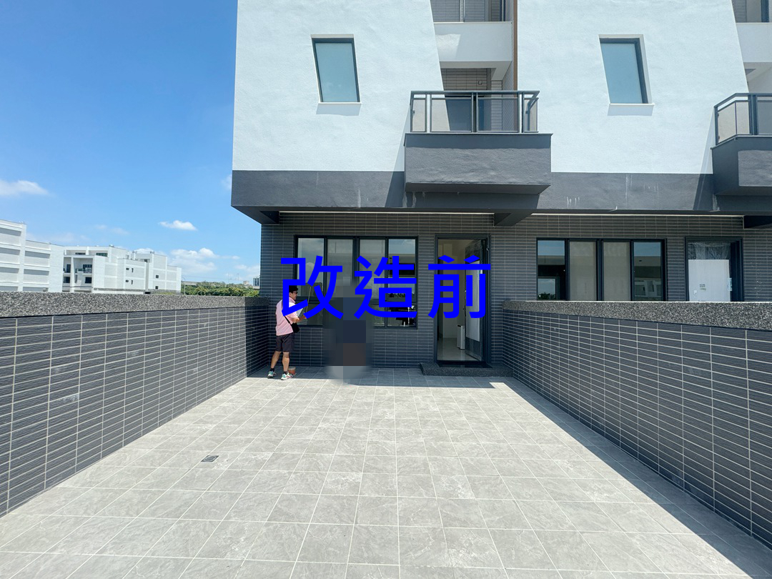 由於業主為邊間,建議鄰路邊的女兒牆以鋁百葉窗和玻璃窗設計,調節採光及通風量。鋁百葉窗鄰居側牆則以固定玻璃隔間。採光罩整體配色和主建築一致,俐落大方。