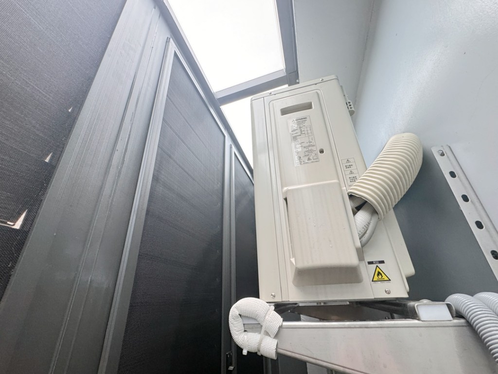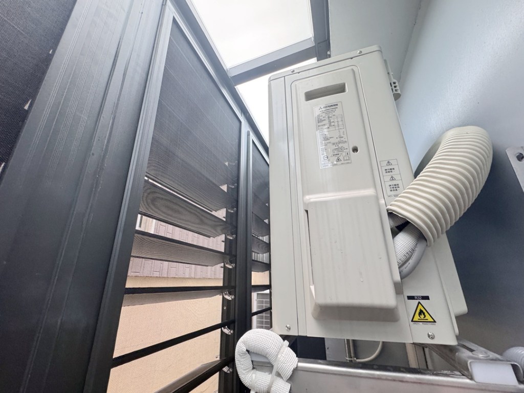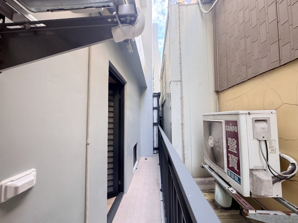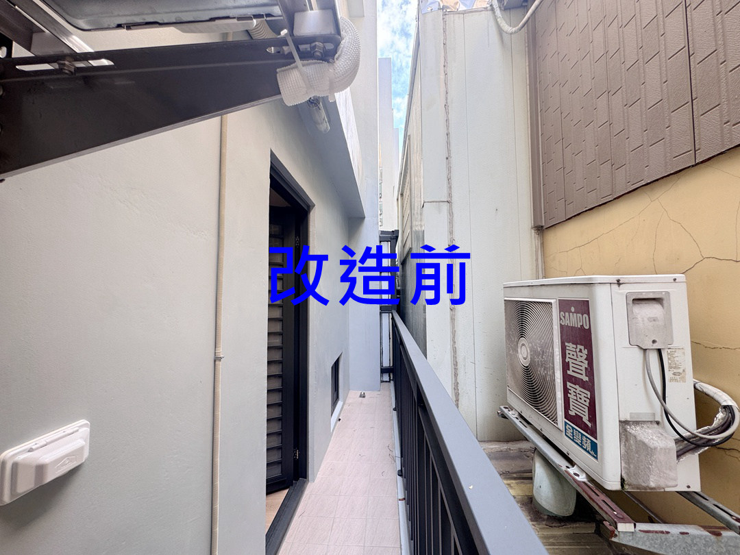 鄰居相鄰的正面,業主希望保留通風和採光,決定採用氣密窗和鋁百葉,相鄰二側則以鋁板封板。全室達到優良的通風與防風防塵效果,全關時成獨立室內空間。