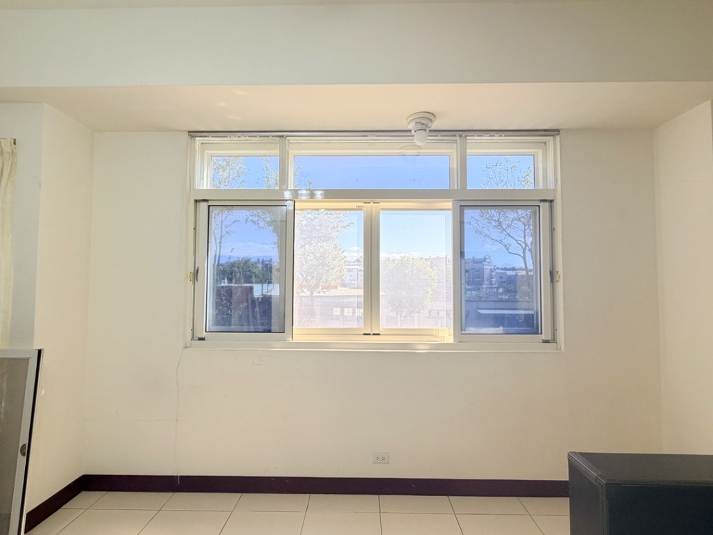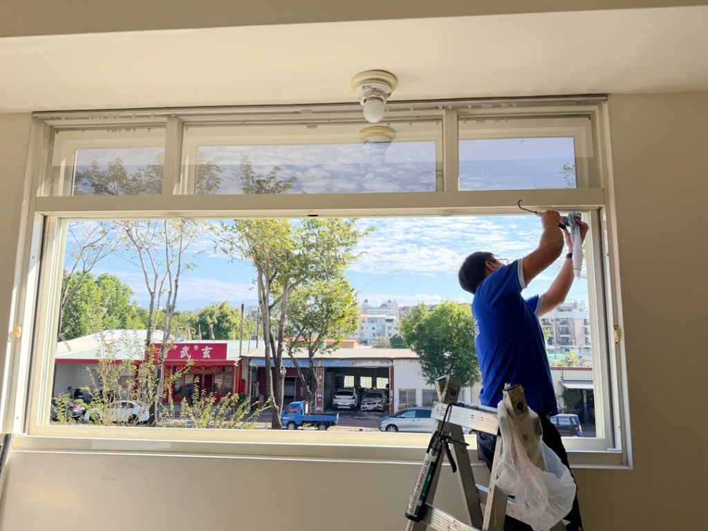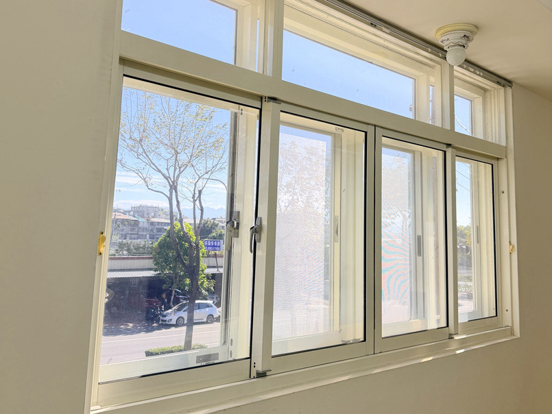 業主選擇外掛窗的方式施工,窗框選用乳白色系,搭配灰色膠合安全玻璃,符合業主降低光線減少熱能的要求。
