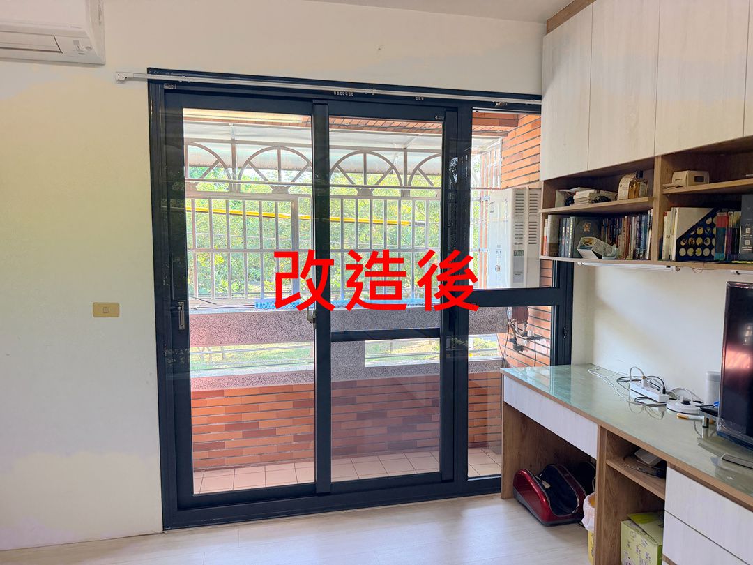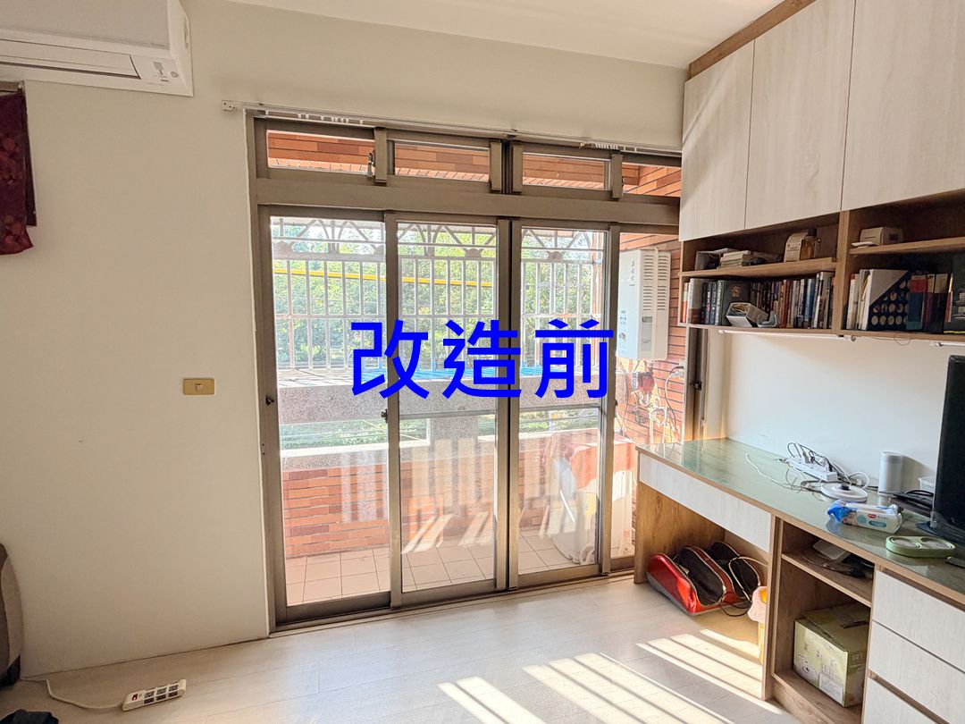 因業主生活動線常由單側進出,建議可改為二拉氣密落地窗+固定玻璃窗,符合業主現今生活習慣,加裝省力把手開關更輕巧方便。