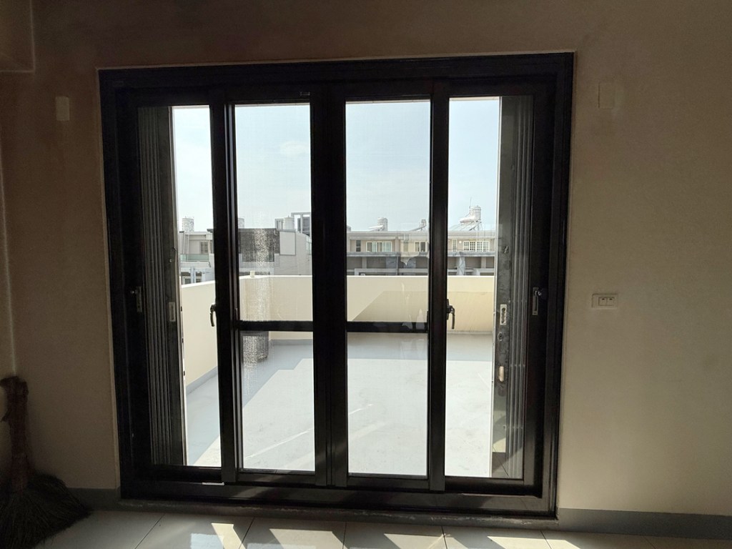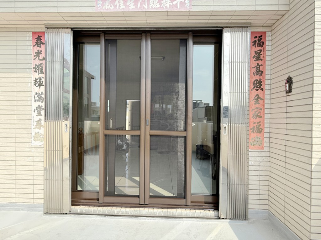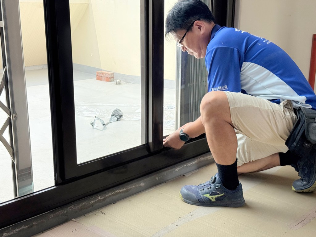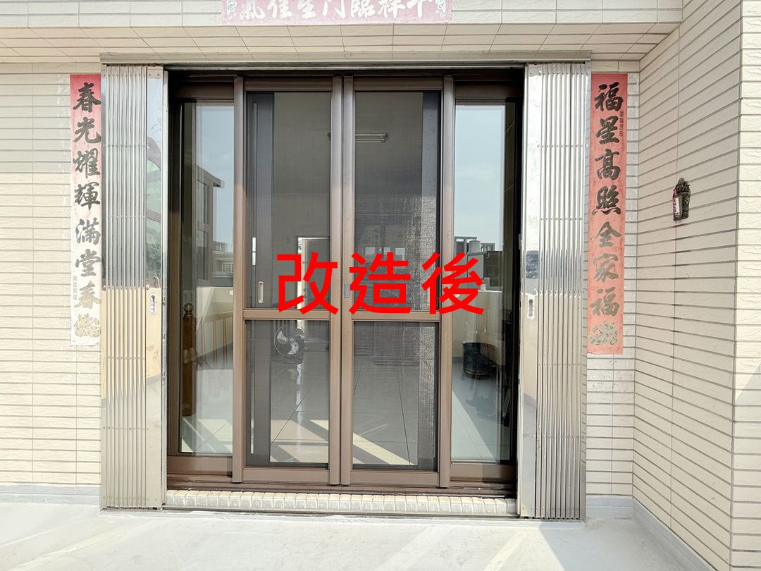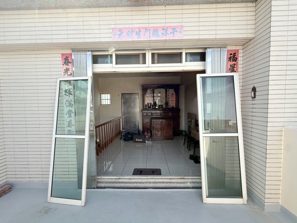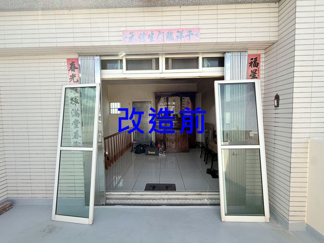 需求:台中外埔的黃先生家神明廳位於四樓,迎風面常感傳統落地窗抗風性不夠,要求更換抗風更強的氣密落地窗。