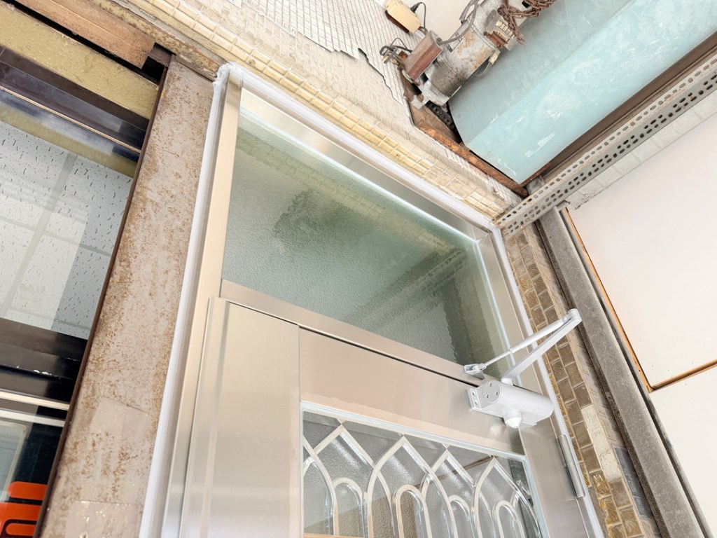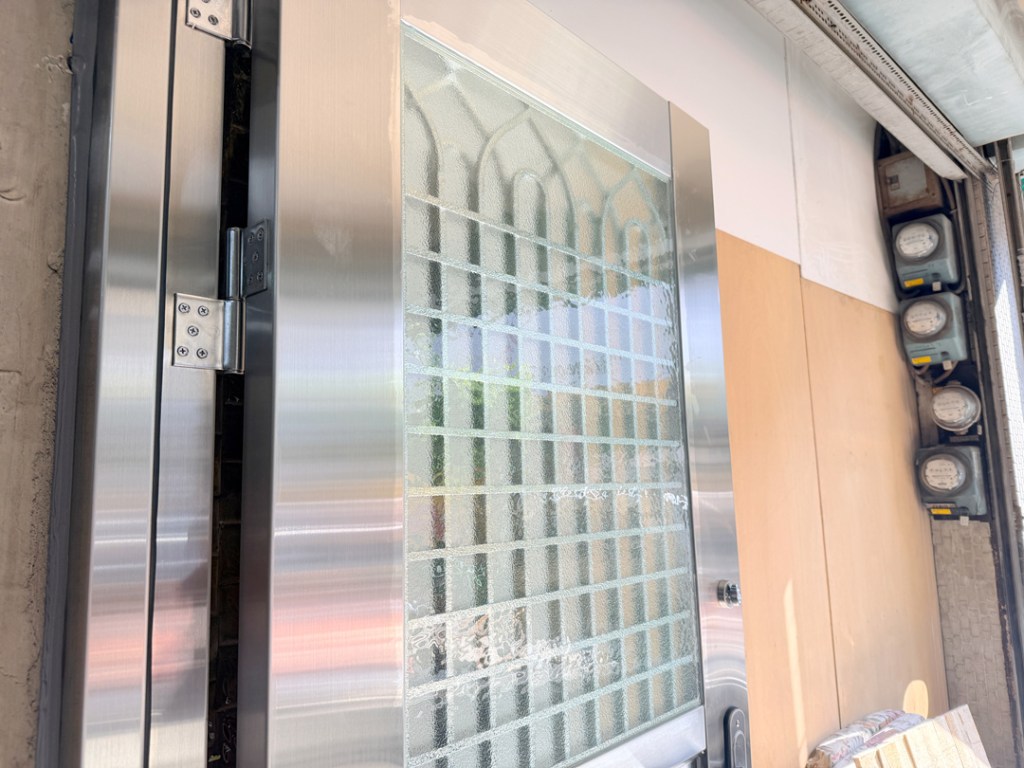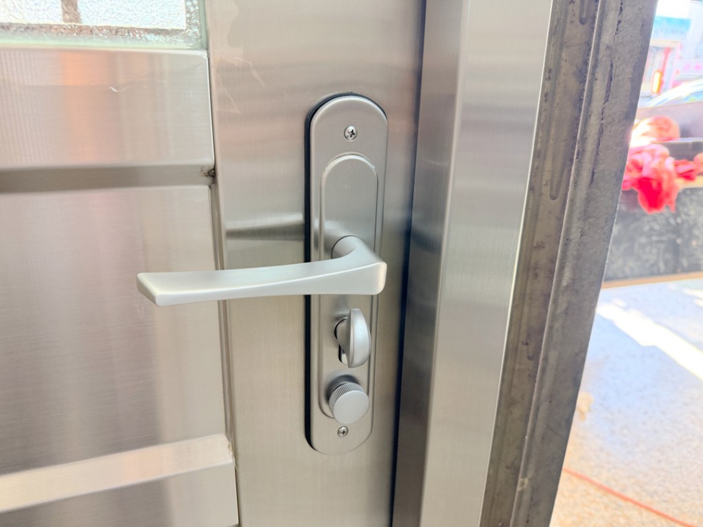 業主選擇白鐵原色的不銹鋼玄關門,搭配霧面玻璃,既保留自然光又有隱私。大門另外加裝門弓器,可自動關門,安全防蚊。