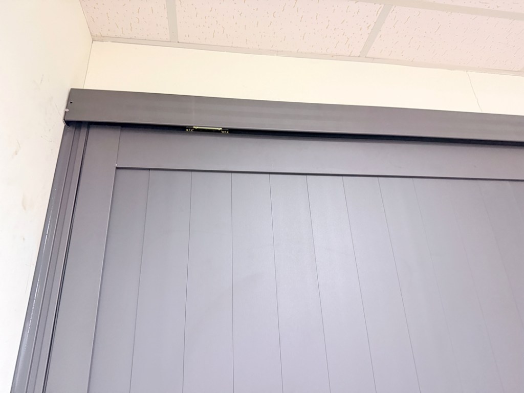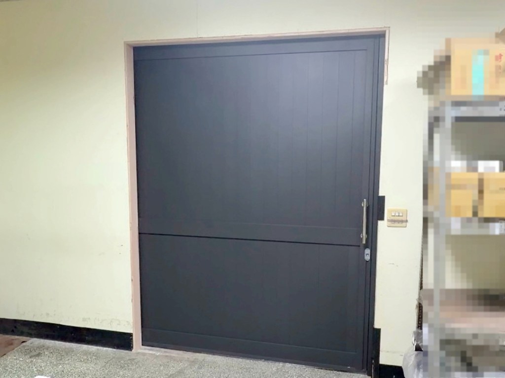 此次業主選擇用鐵灰砂色系的全鋁板門,適合廠區推車頻繁進出使用,施工當日完成。