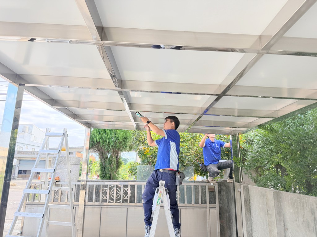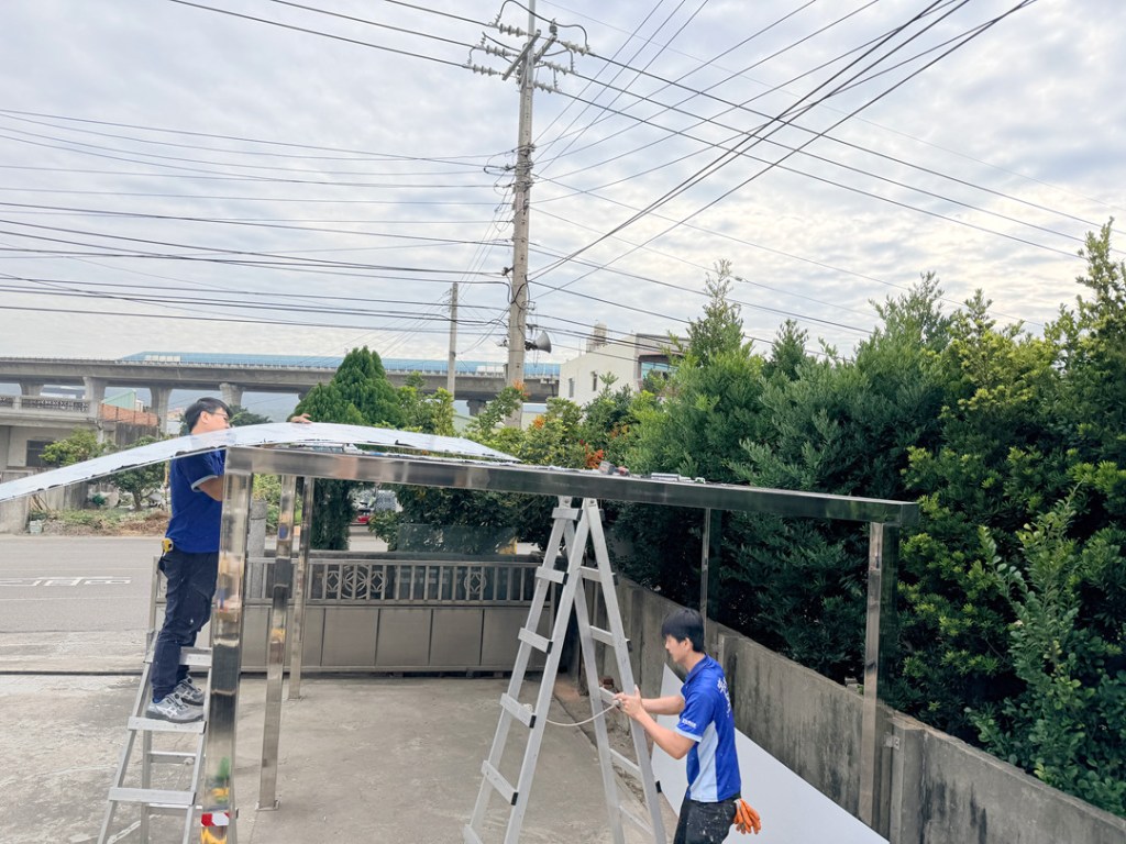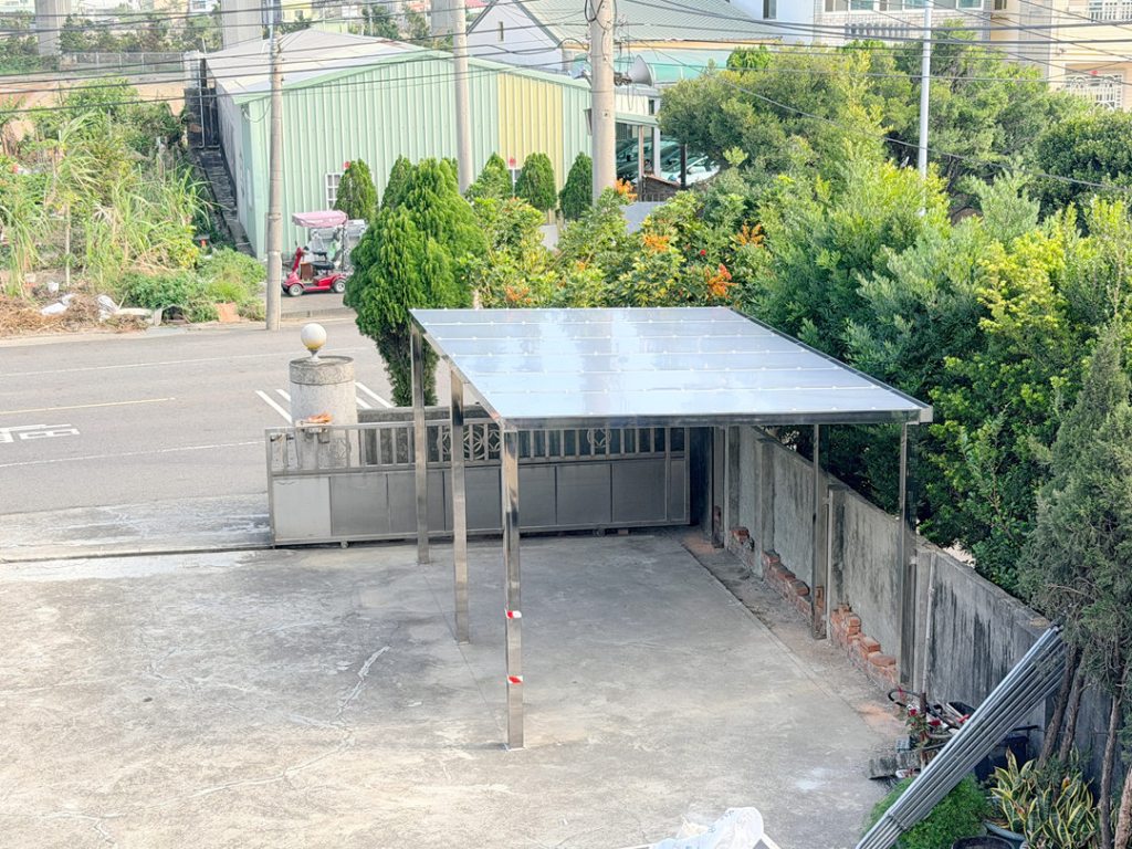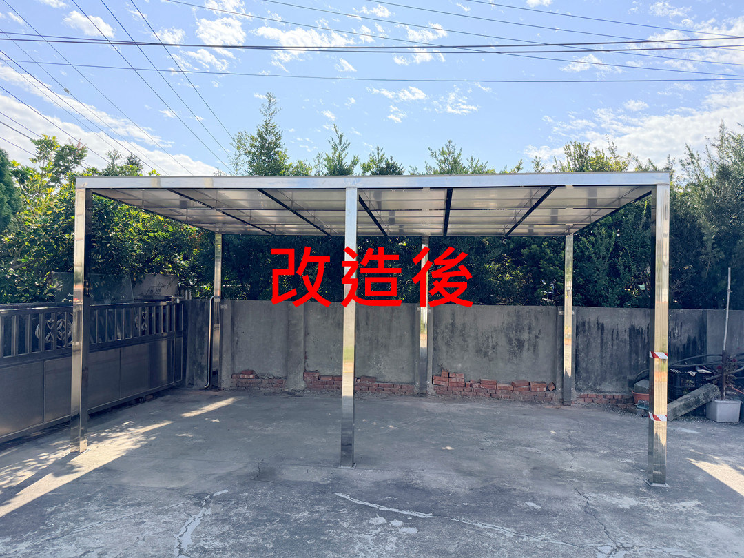 業主選擇不銹鋼骨架搭配不透光的鋁塑板搭建車庫,達到防晒又穩固不怕颱風的需求。