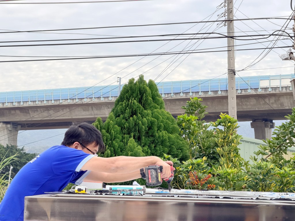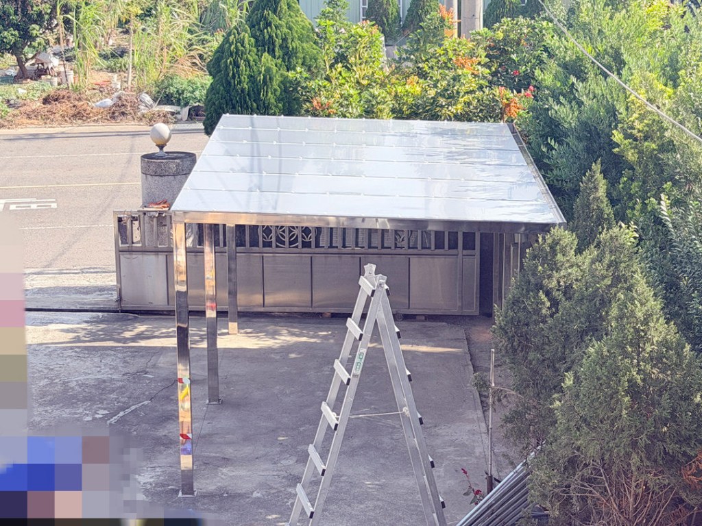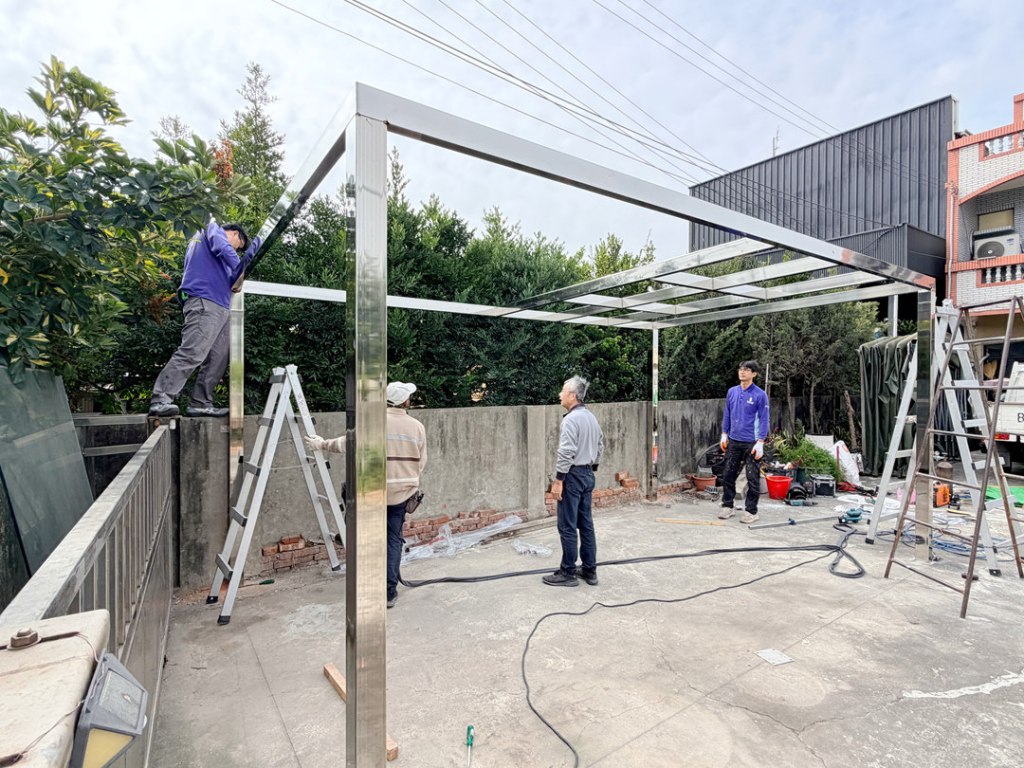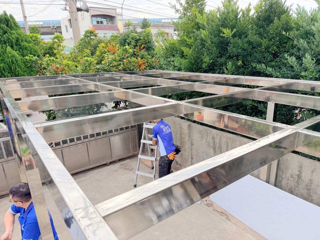 業主選擇不銹鋼骨架搭配不透光的鋁塑板搭建車庫,達到防晒又穩固不怕颱風的需求。
