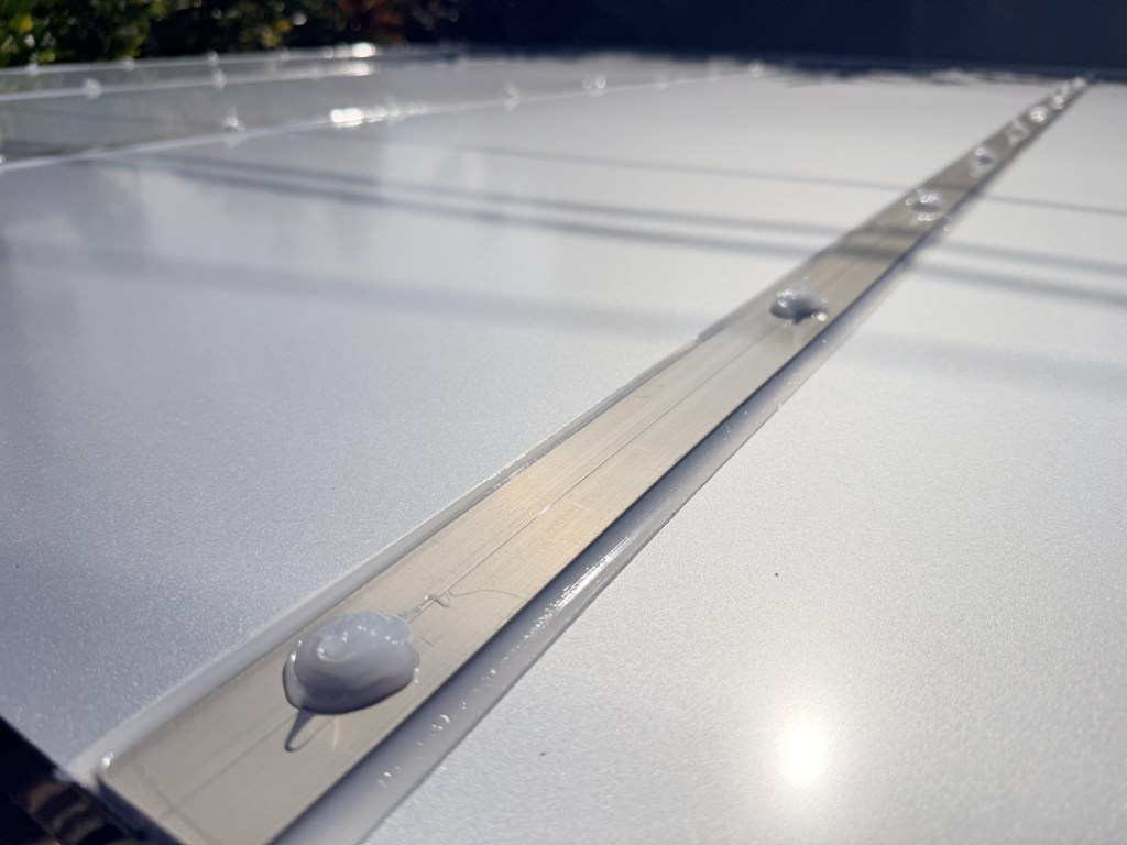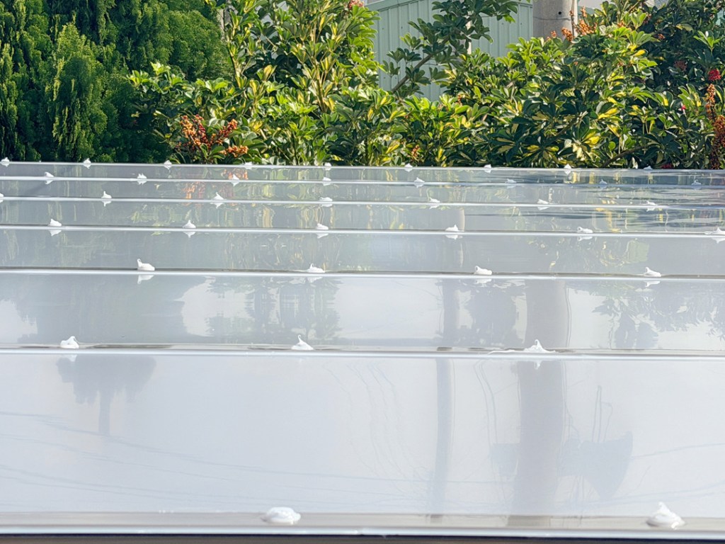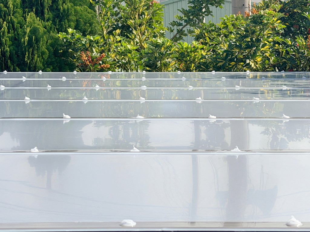 膠合安全玻璃 – 安全透光耐久漂亮。鋁塑板 – 安全不透光防晒耐久。PC板 – 透光不耐久會脆化。