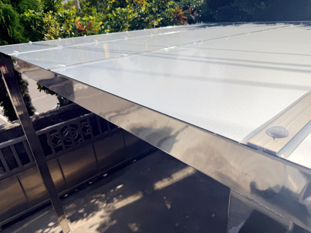 解決方案:建議採用不銹鋼骨架作成的採光罩車庫,上層選擇鋁塑板,不透光又能防晒防雨。