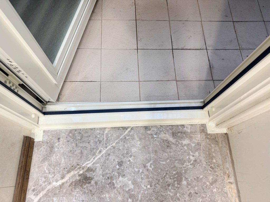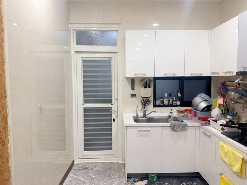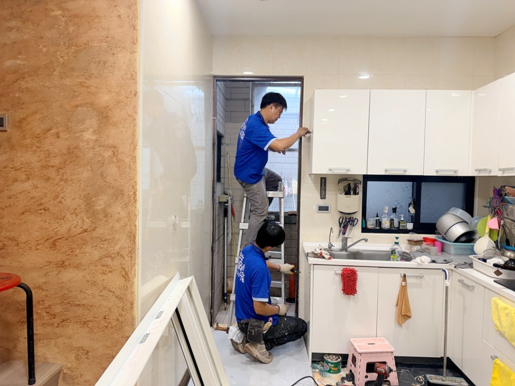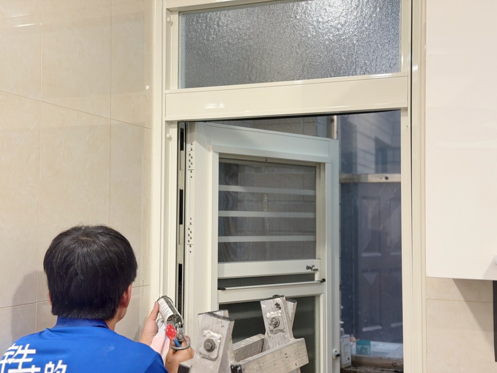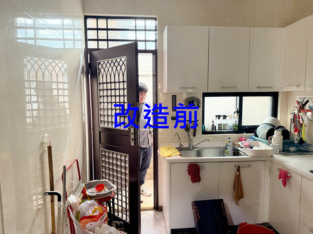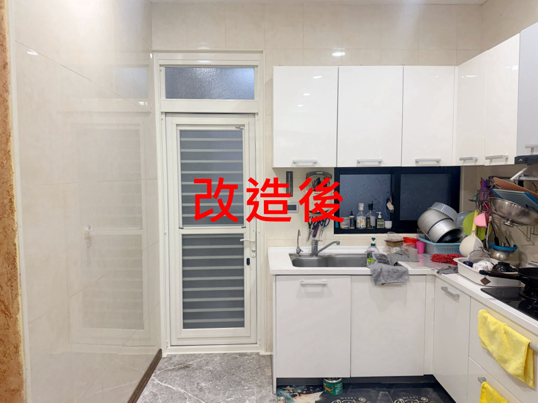 業主選擇乳白色鋁框,搭配霧面玻璃,改為外開門方向,讓廚房煥然一新動線更好。乾式施工,施工當天完成。