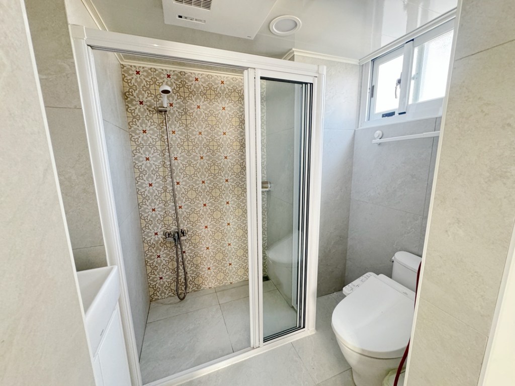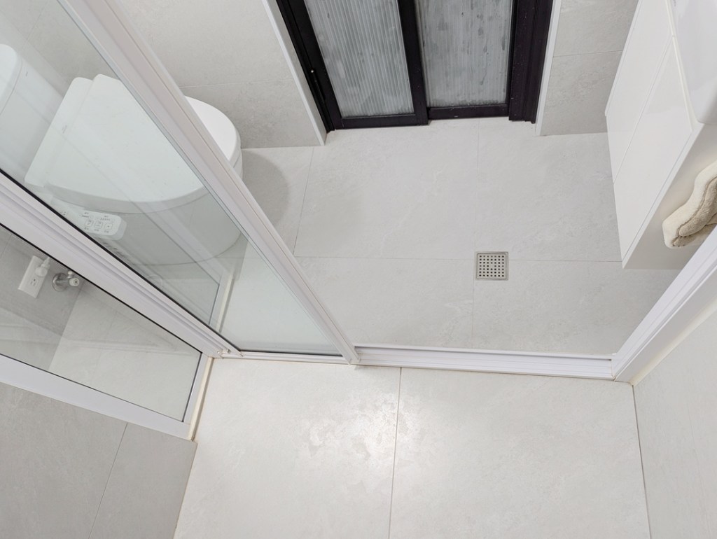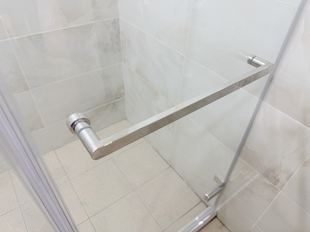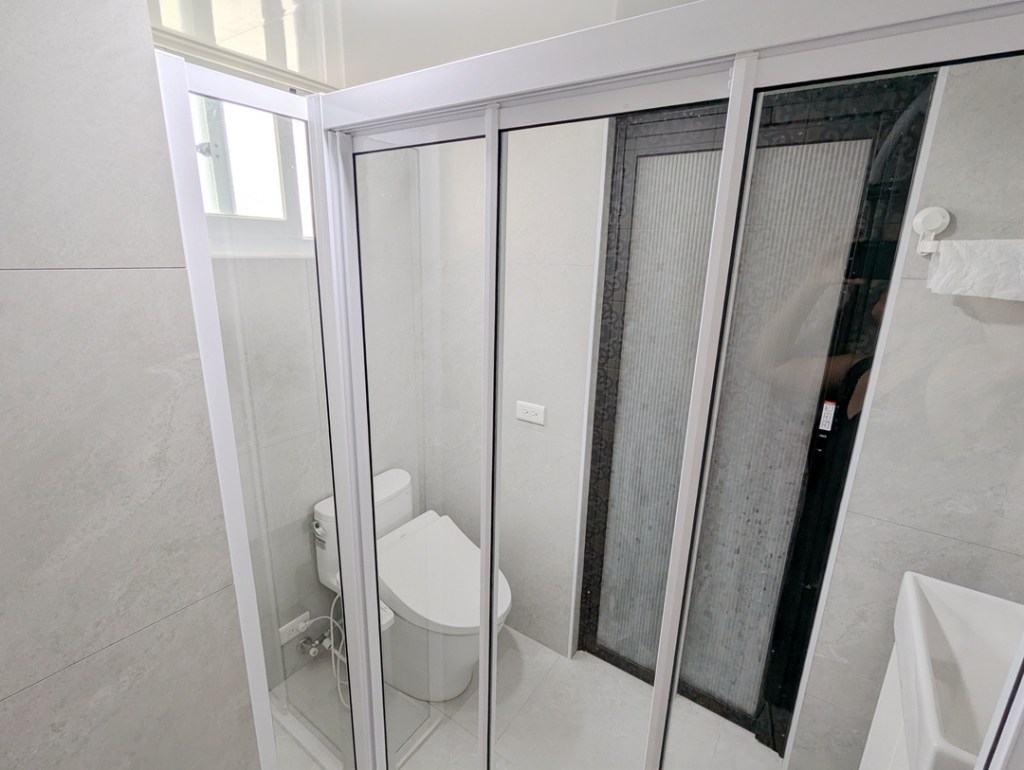 此次業主選用霧面玻璃板搭配純白色門框,不僅防水實用,還兼具霧面質感與安全性,能避免沐浴時玻璃透明造成的尷尬,提升整體空間隱私與美感。並加裝毛巾架,實用好清理。