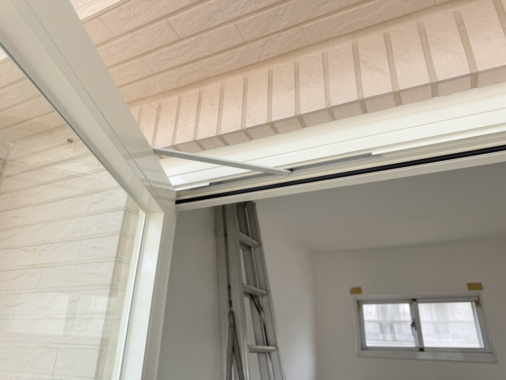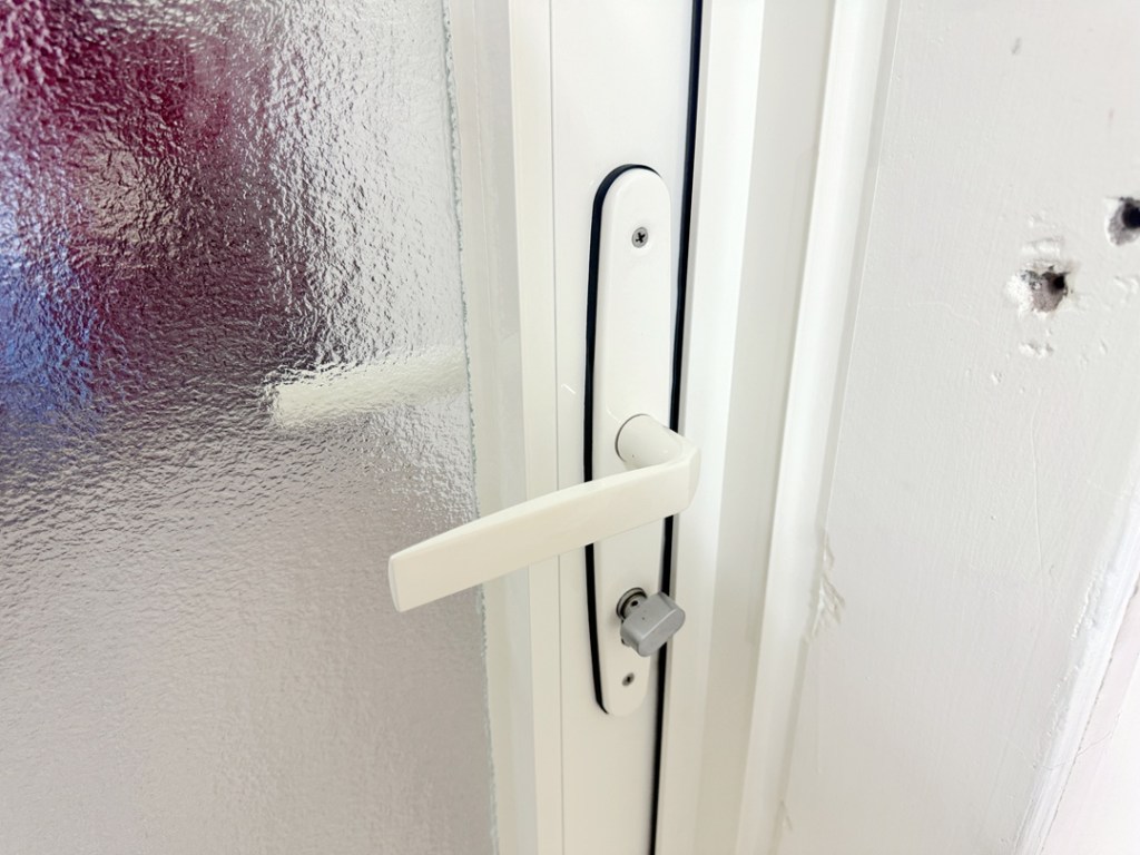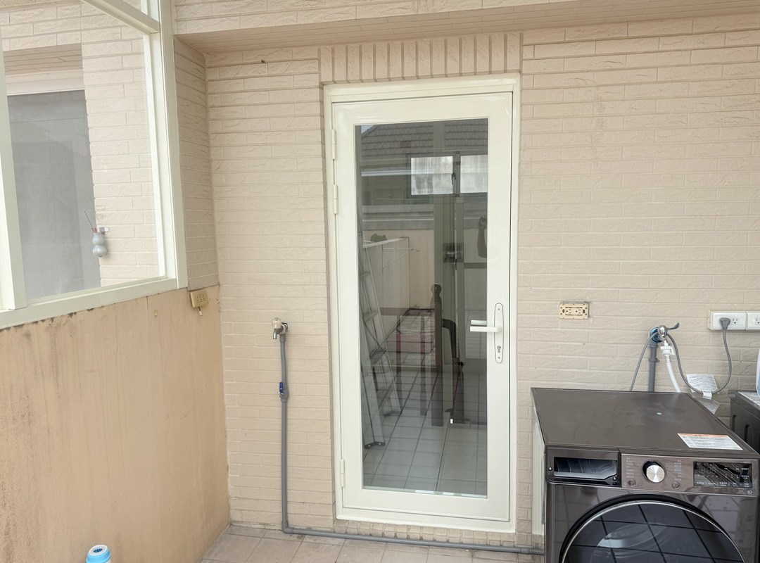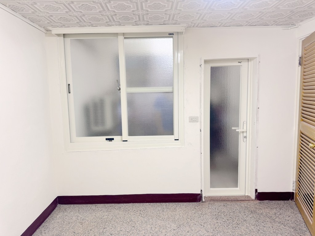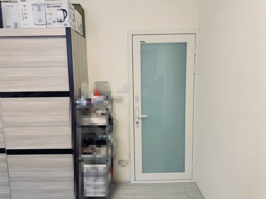 業主傾向保留原落地玻璃只改門,新門框搭配原裝潢的白色系;面板玻璃則選擇白膜膠合安全玻璃,不易破裂。