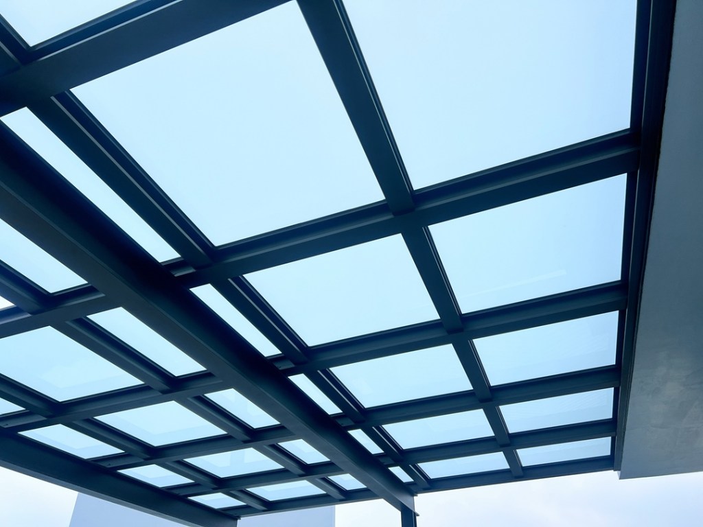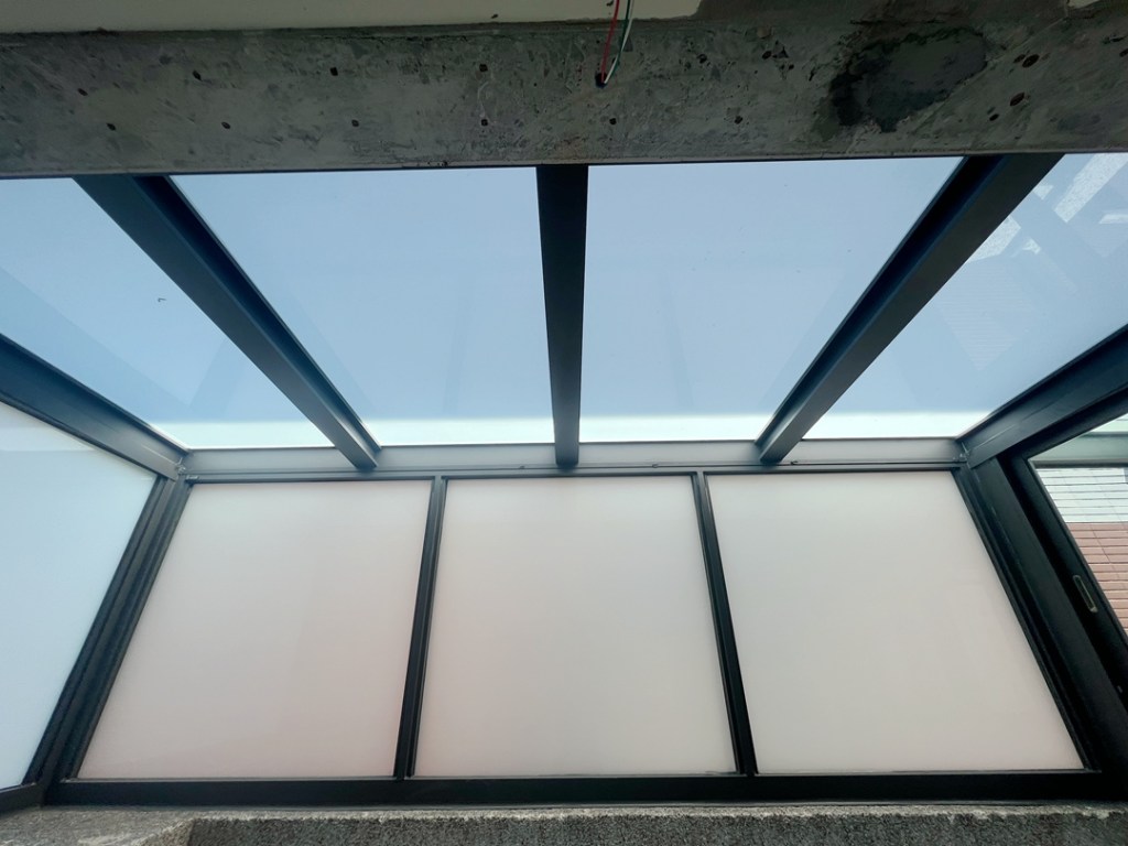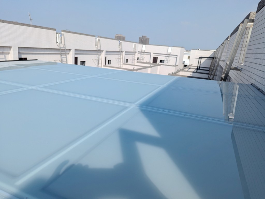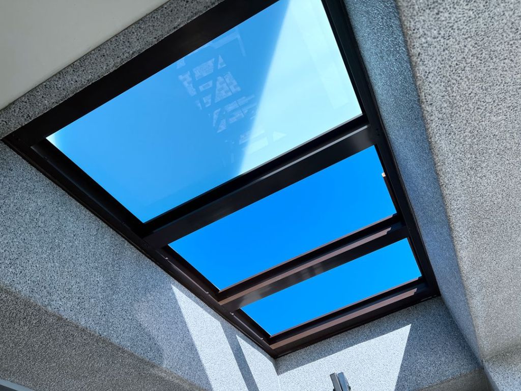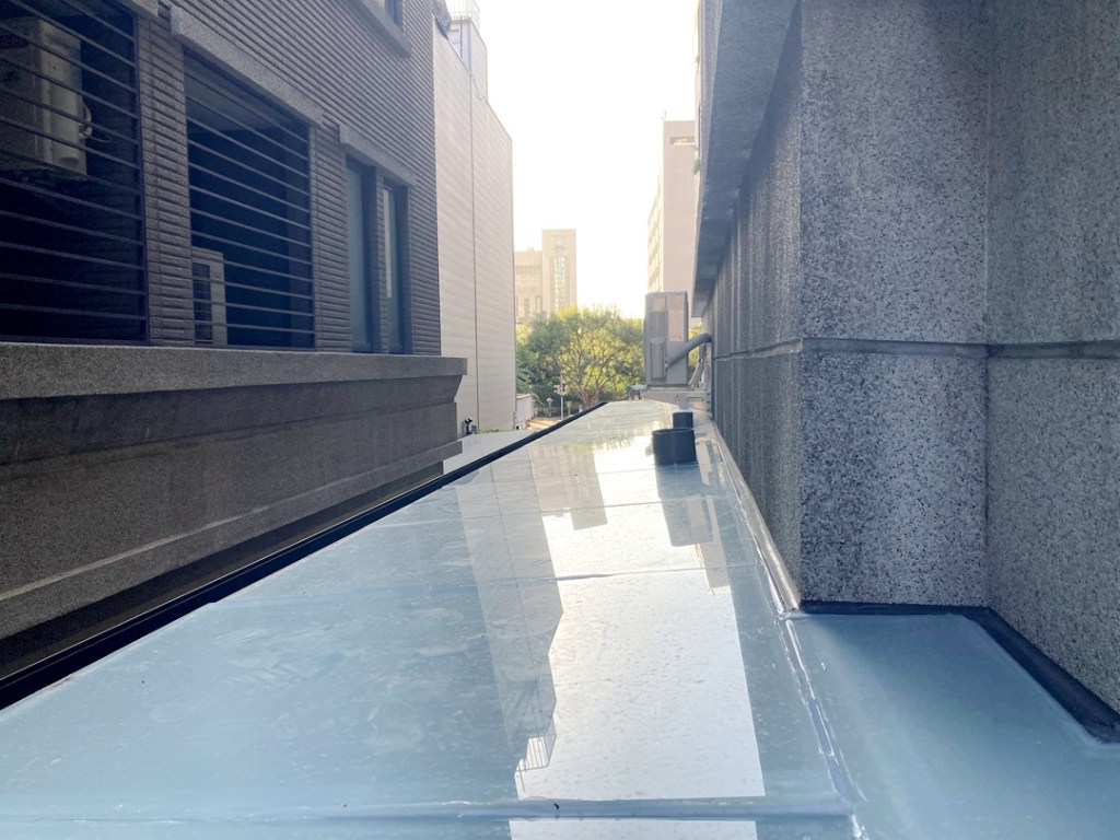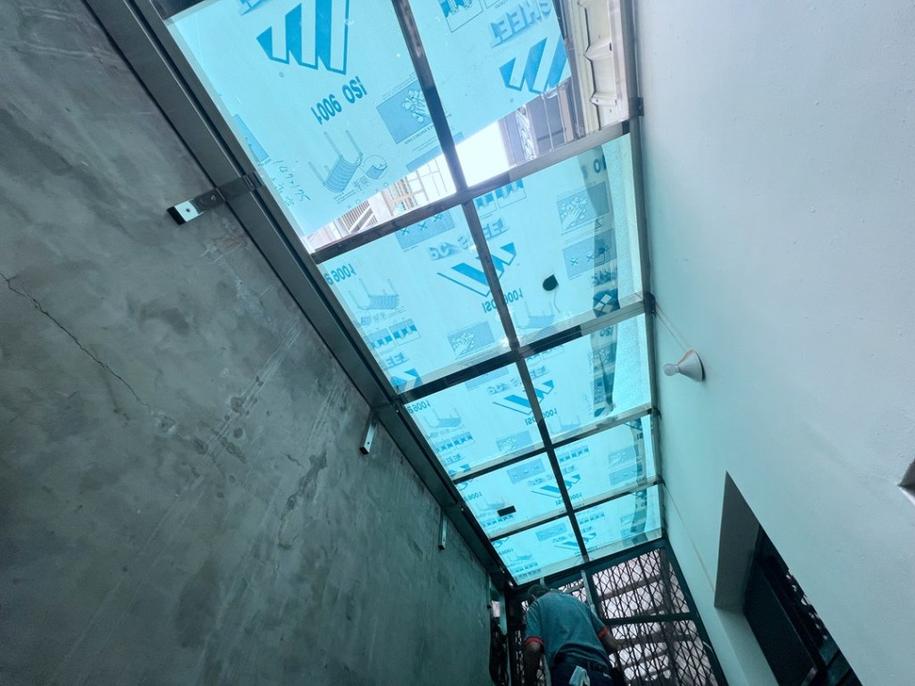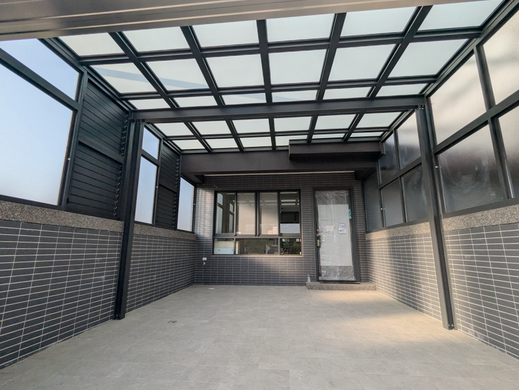 採光罩結構採用鋁合金骨架搭配膠合安全玻璃,相較於傳統PC板材質,不僅更耐候耐用,亦具備更高的安全性與穩定性。玻璃上層設計提供絕佳自然採光,讓整體空間明亮通透。
