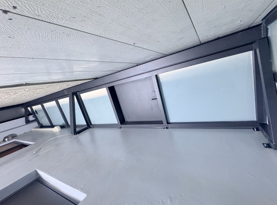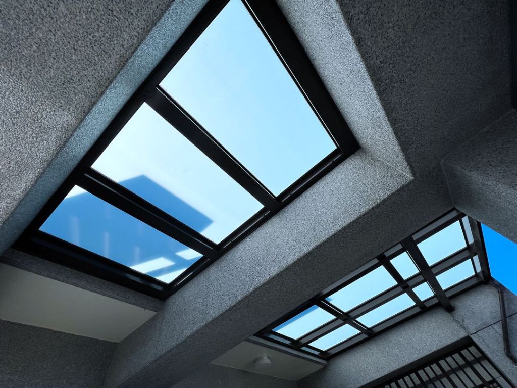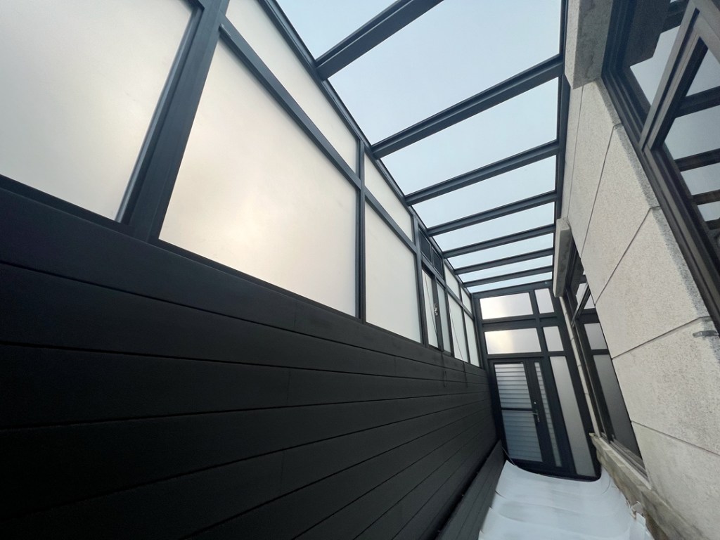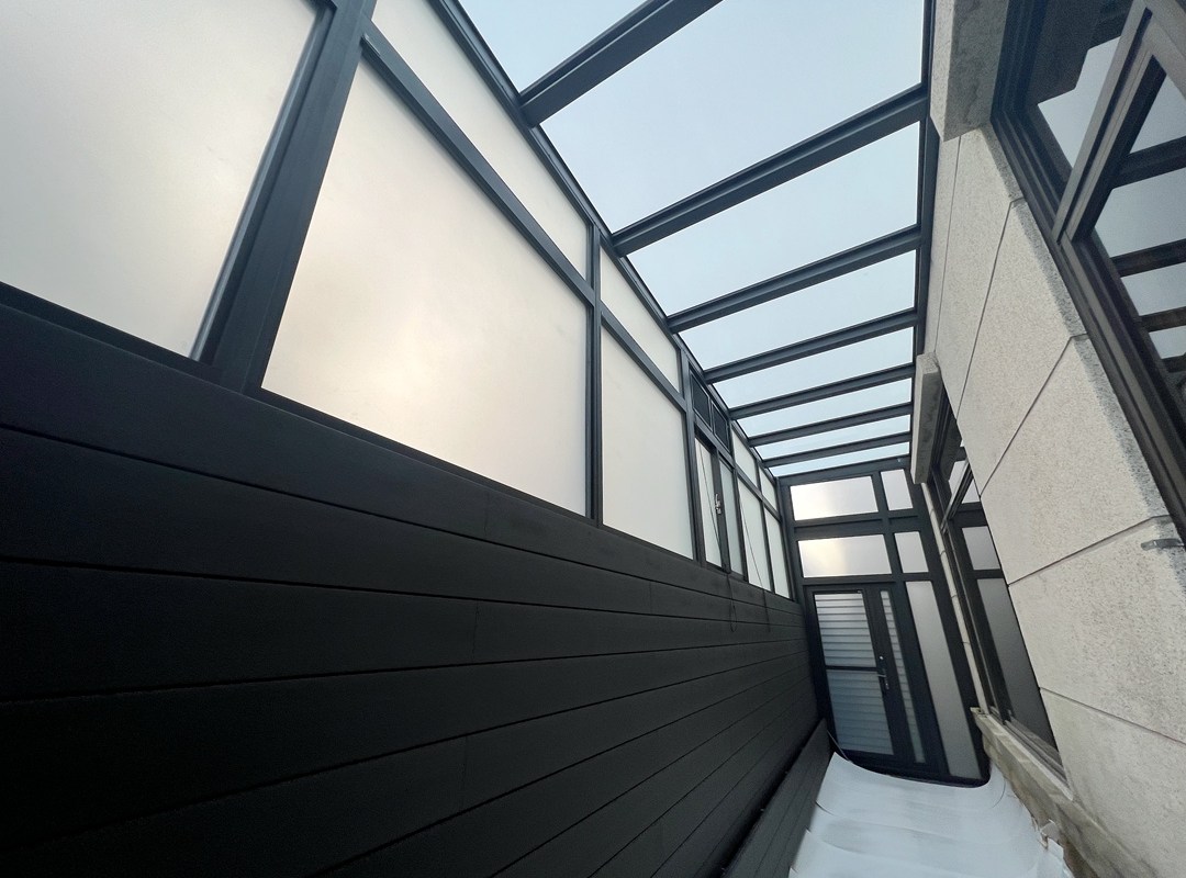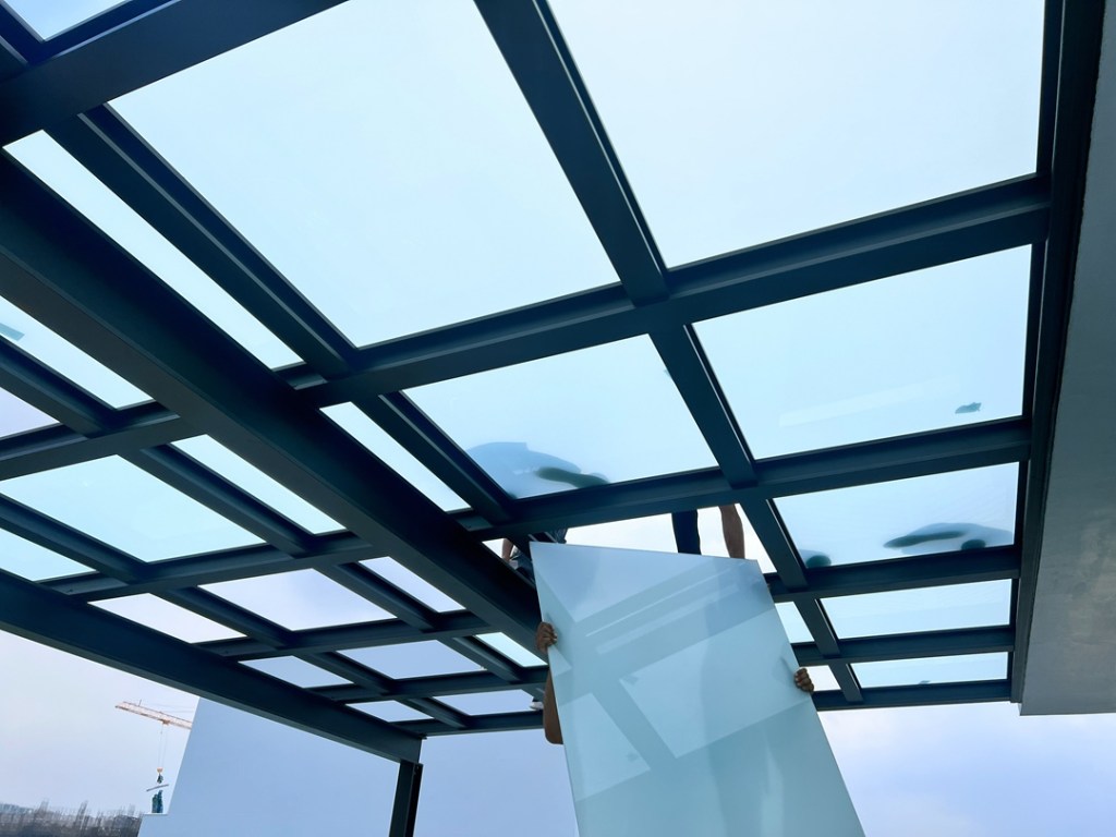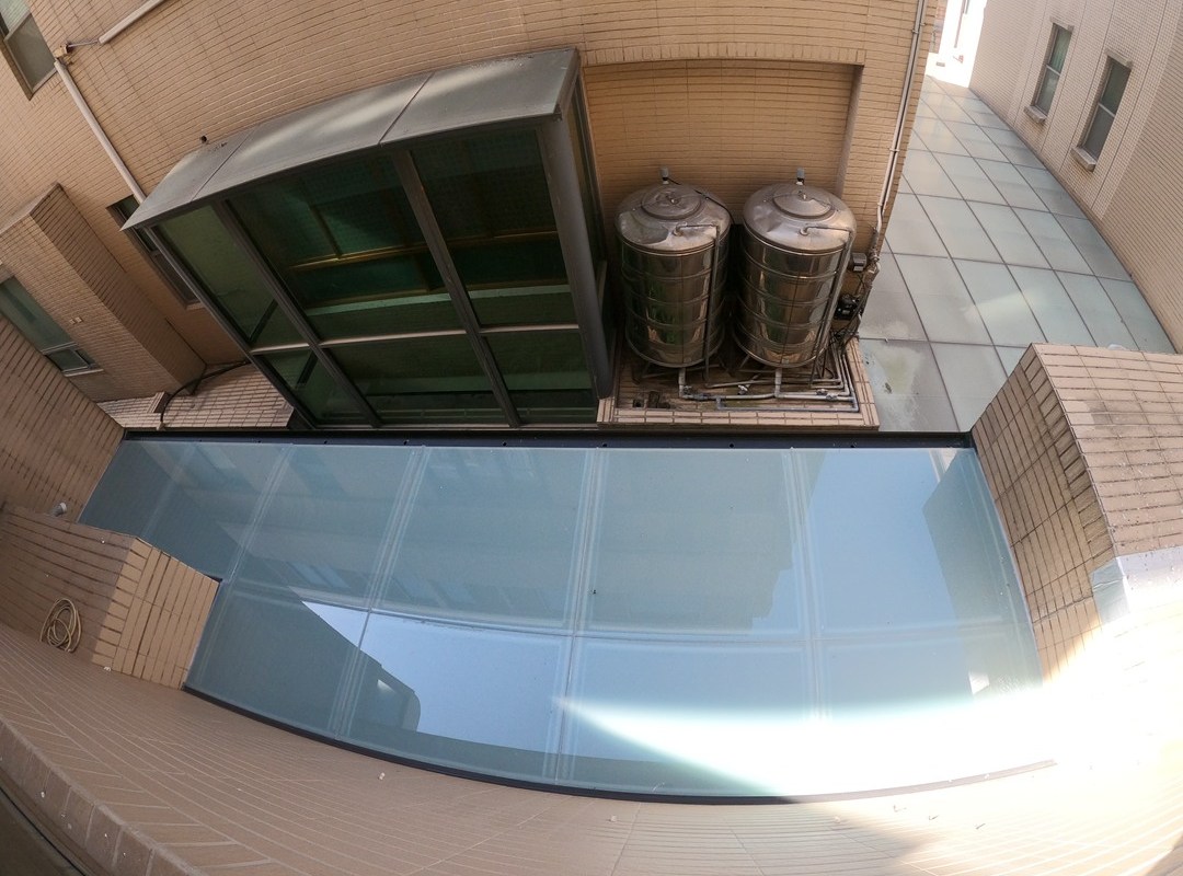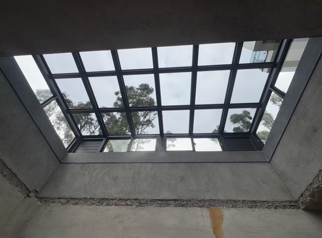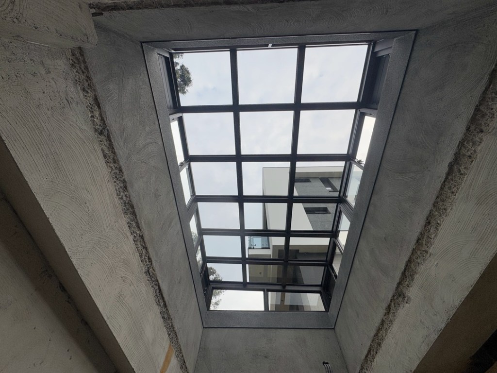 採光罩結構採用鋁合金骨架搭配膠合安全玻璃,相較於傳統PC板材質,不僅更耐候耐用,亦具備更高的安全性與穩定性。玻璃上層設計提供絕佳自然採光,讓整體空間明亮通透。